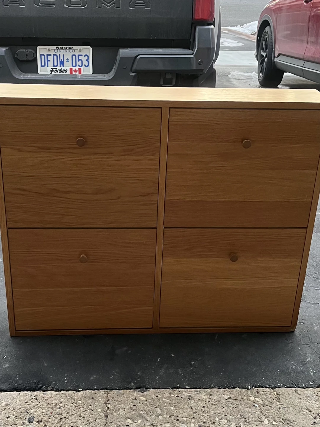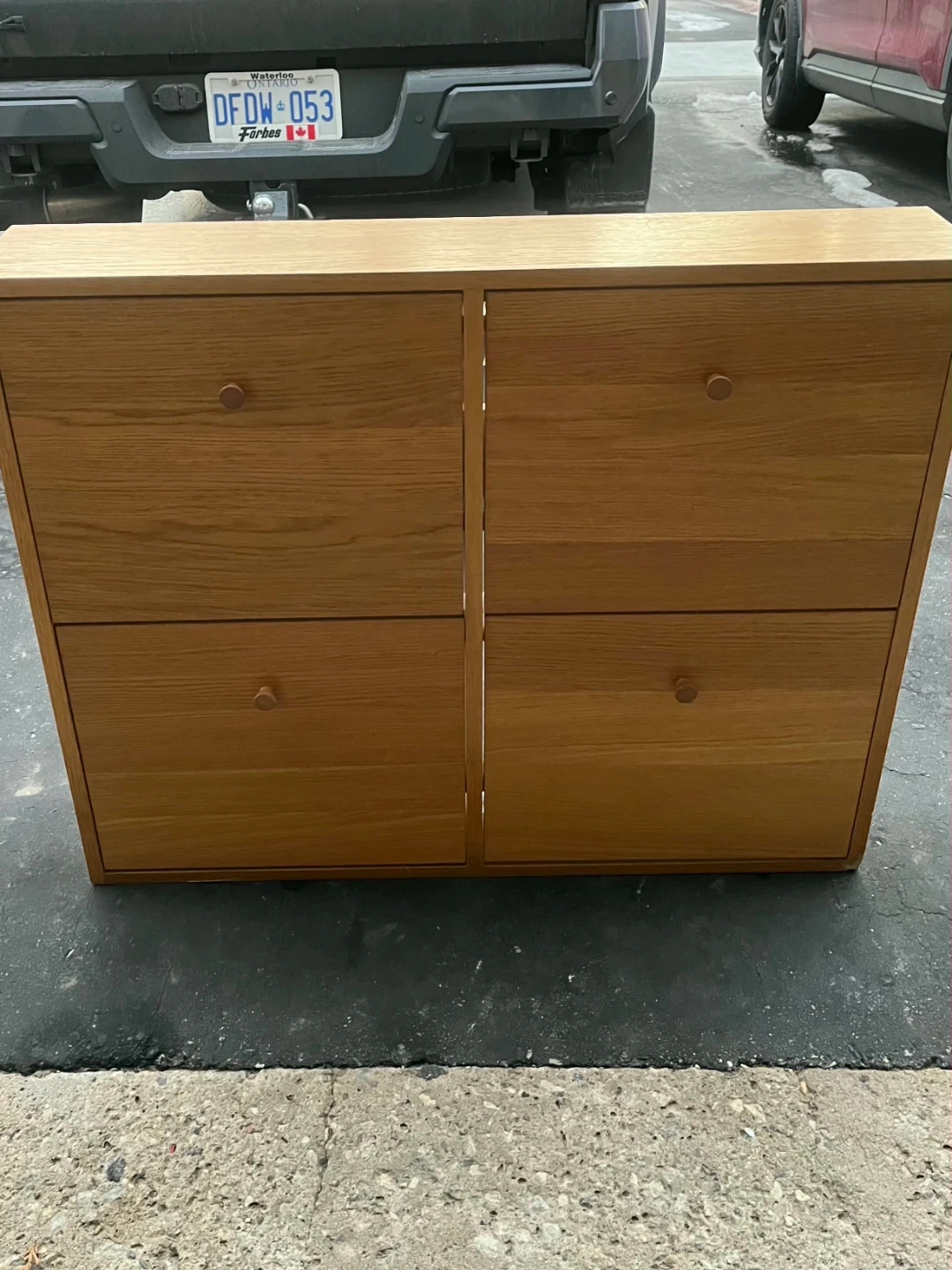 Selling a solid oak shoe cabinet! It's in great condition and ready to organize your entryway or closet. The natural wood grain adds a warm touch to any space. Perfect for keeping shoes tidy and out of sight
