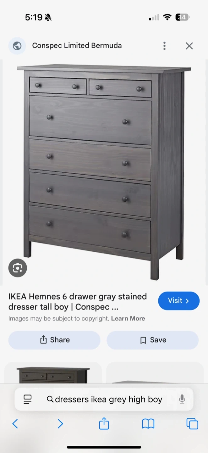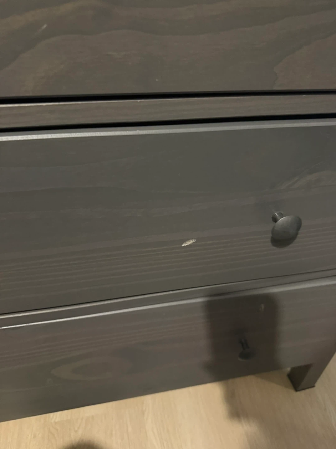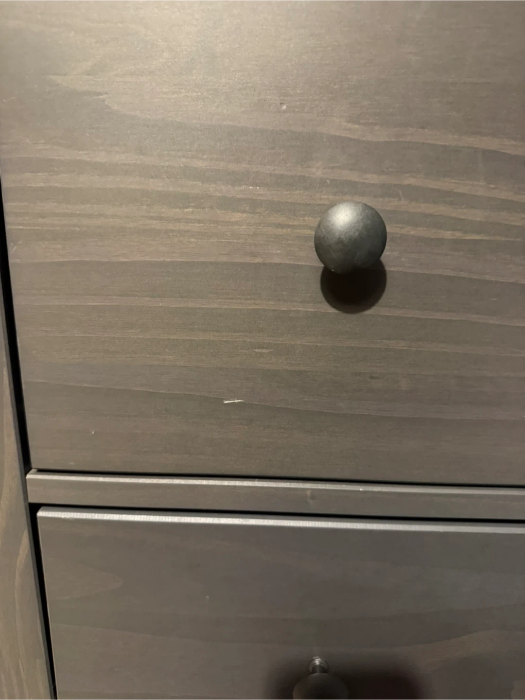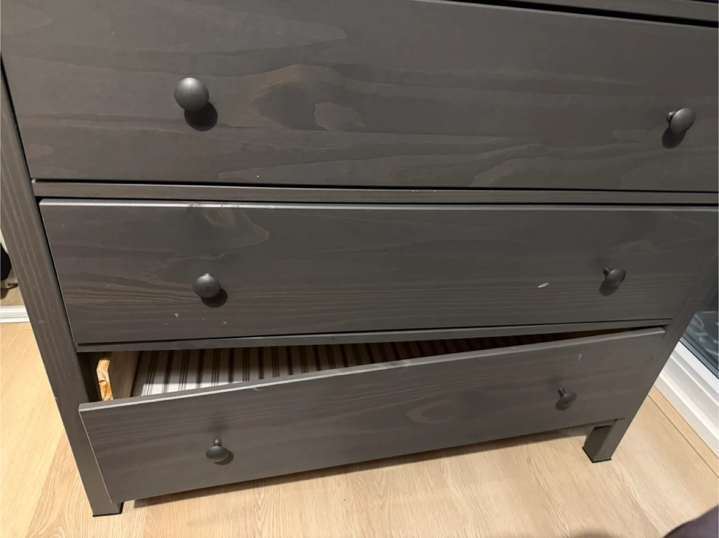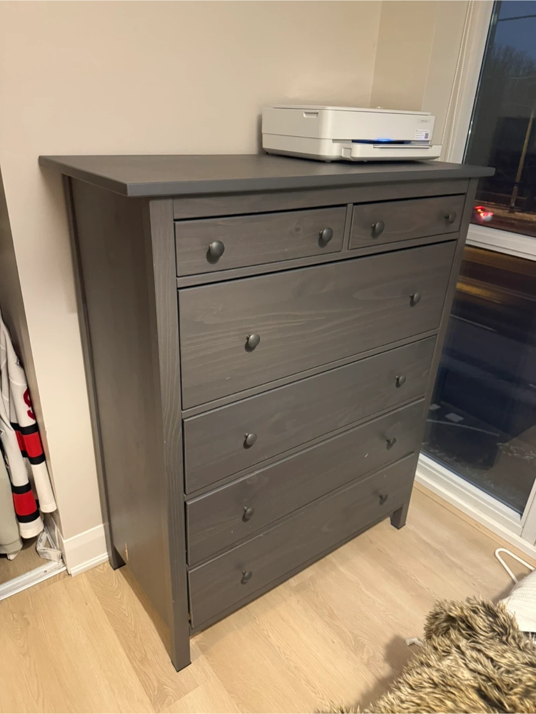 Selling a used IKEA Hemnes 6-drawer dresser in gray stained finish. It's a tall boy style dresser. There are some minor signs of wear, including a small scratch on one of the drawers and a chip near the bottom. Please see the photos for details!