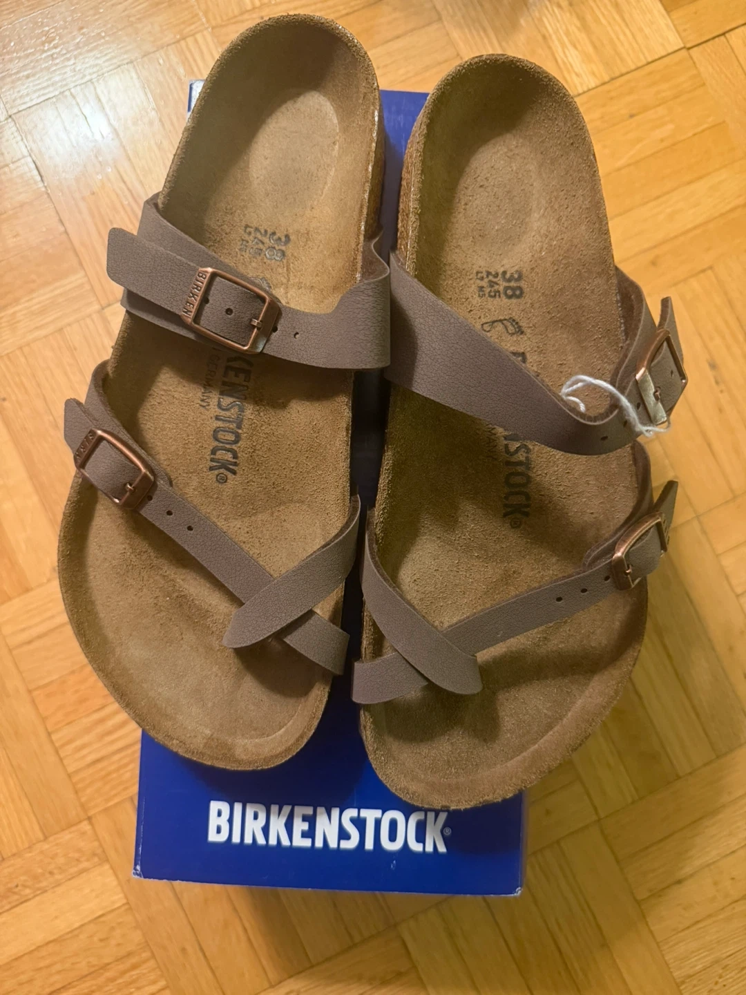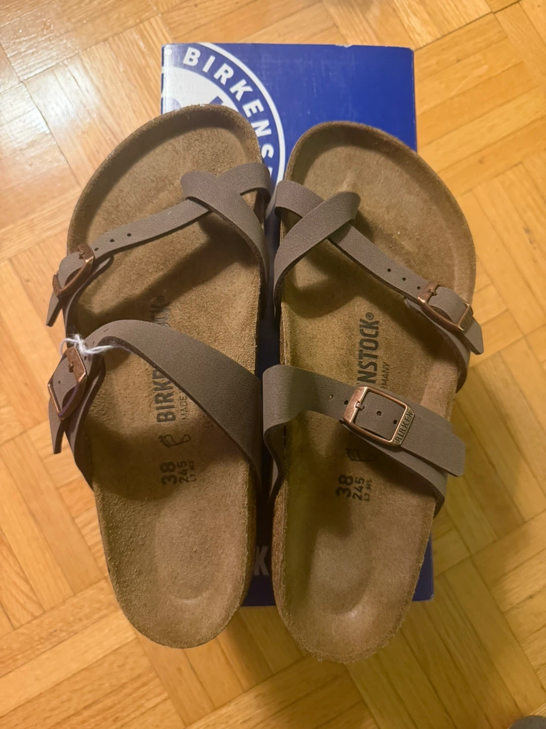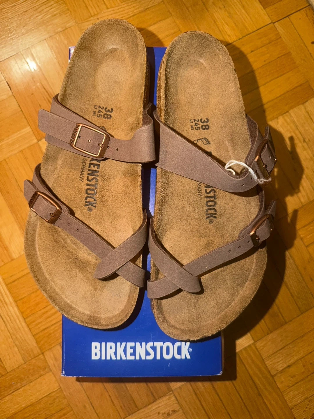 Selling a pair of Birkenstock Mayari sandals in mocha colour. They are a size 38, which is a US size 7. Comes with the original box! Originally bought for $130