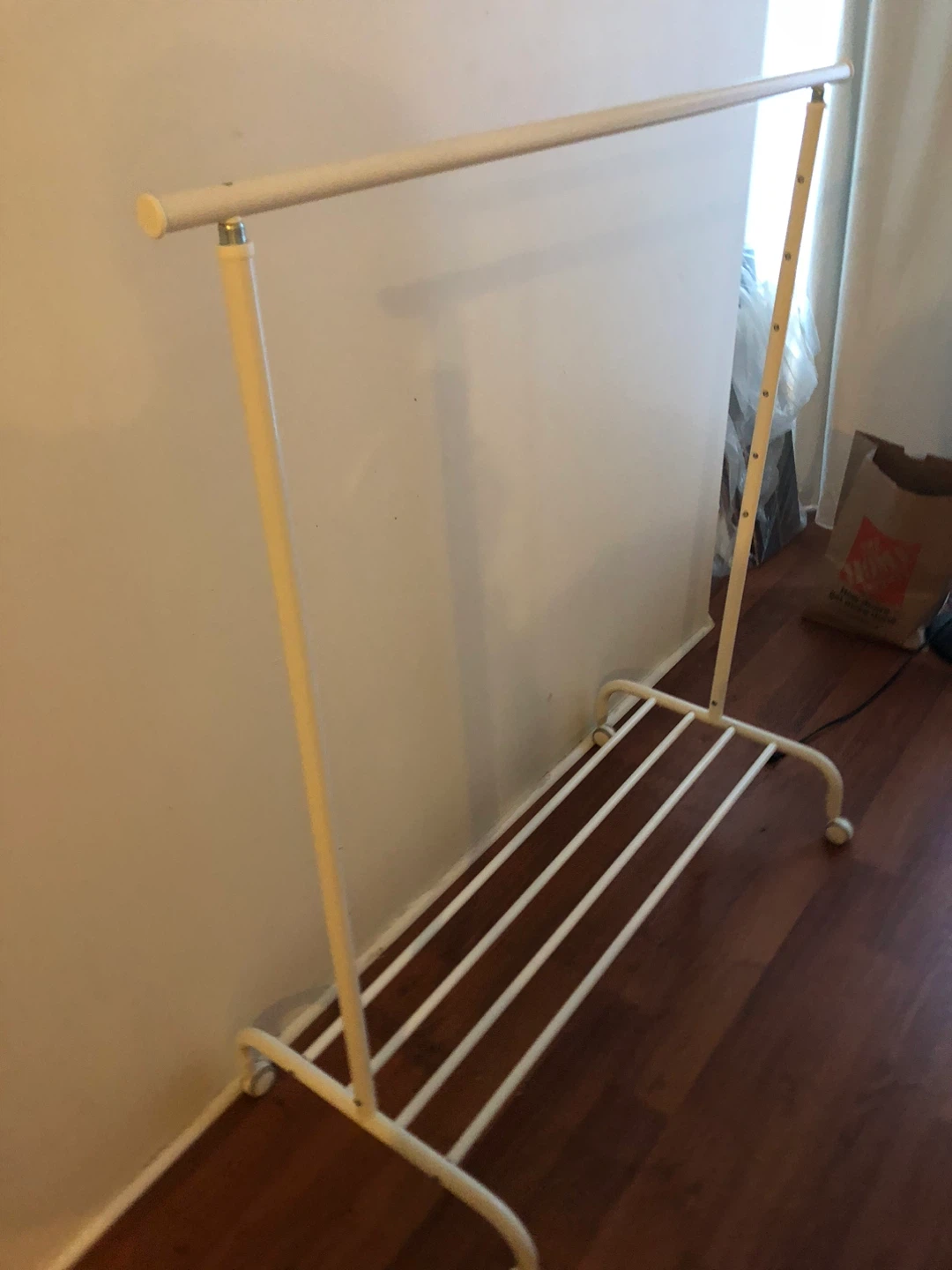 Selling a clothes rack in great condition! It's white and has a shelf at the bottom for shoes or other items. Perfect for adding extra storage to your closet or bedroom.