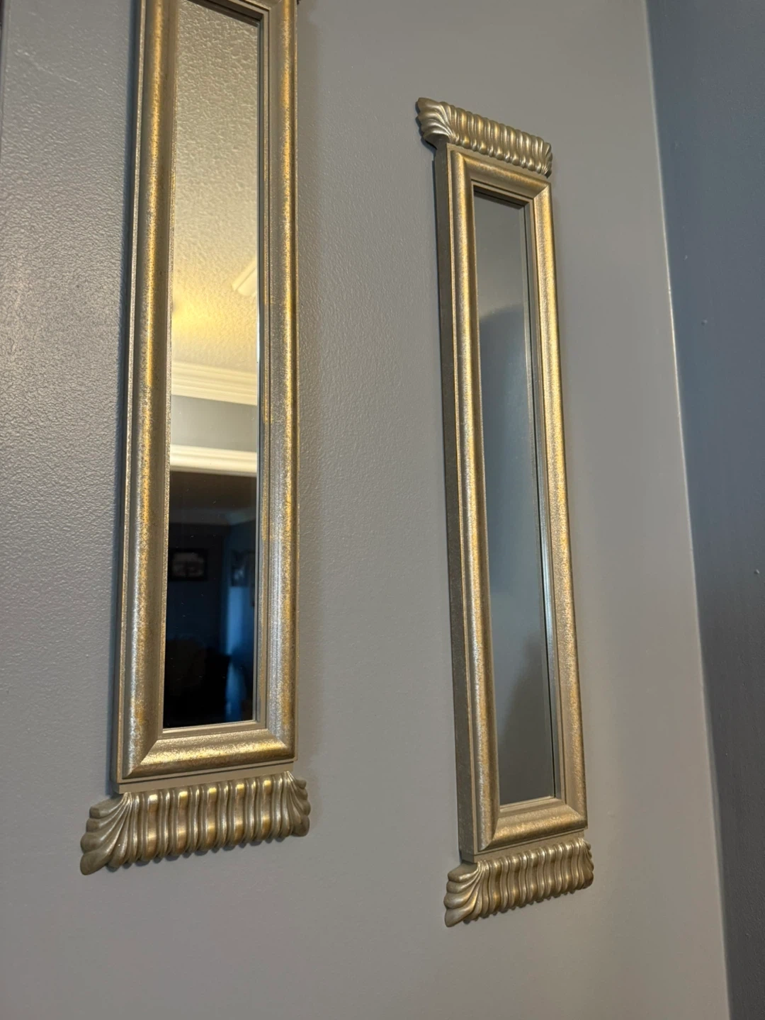 Here are two decorative wall mirrors! They have a gold-tone frame with an ornate design at the top and bottom. They would look great in any room!