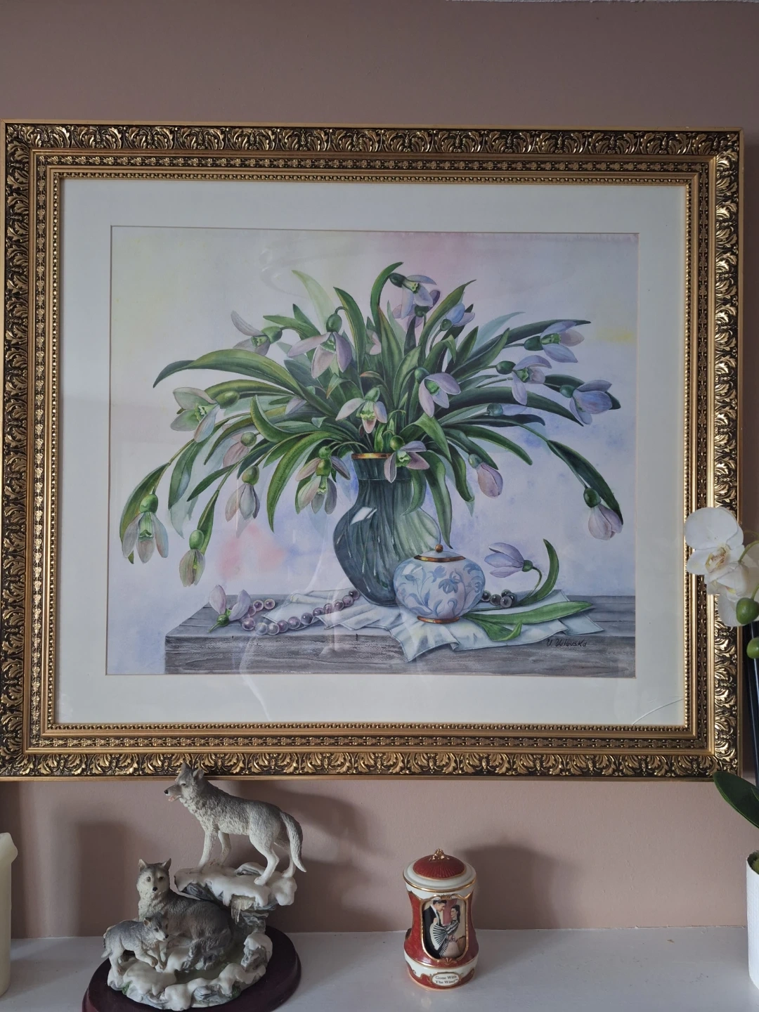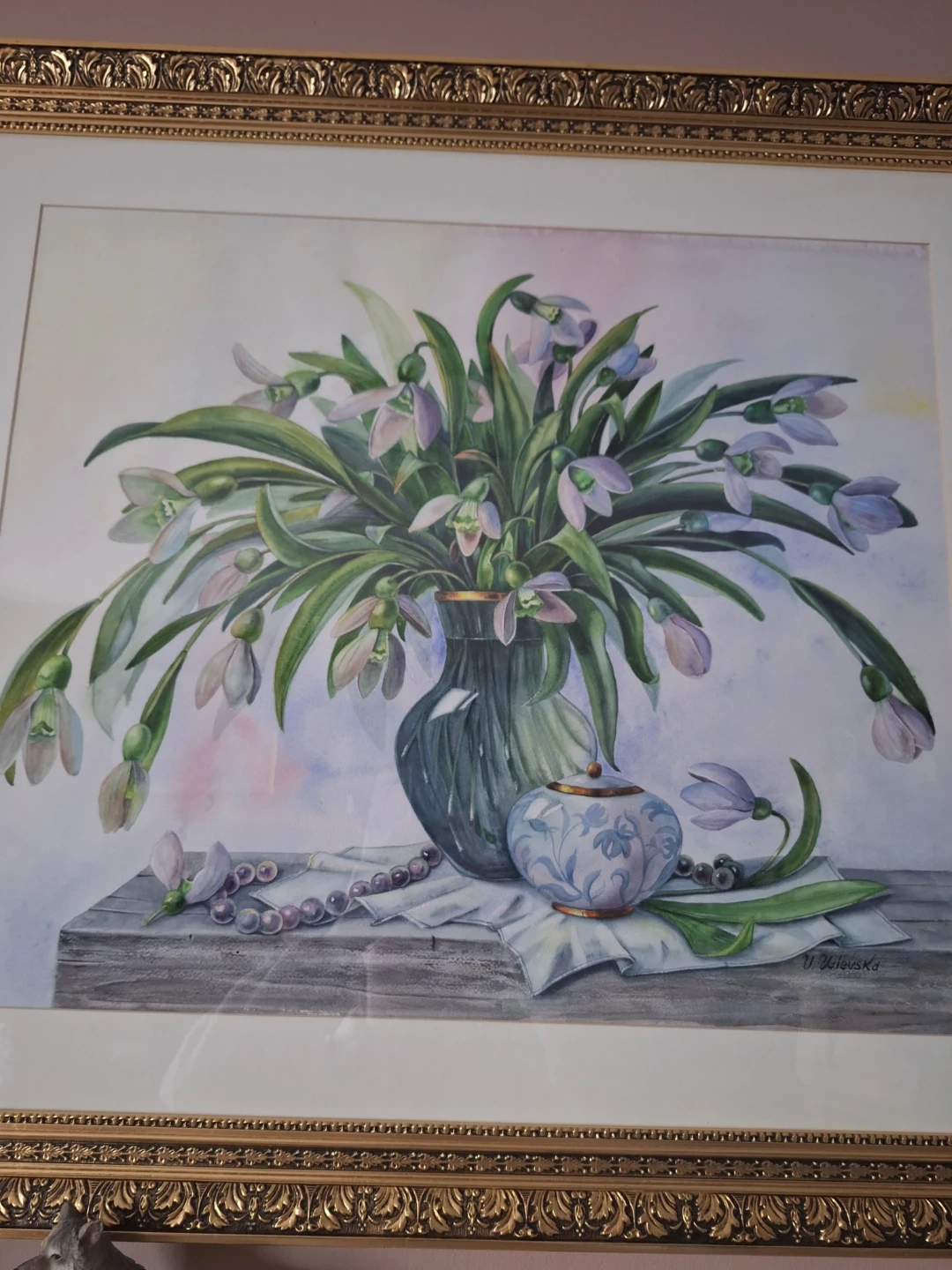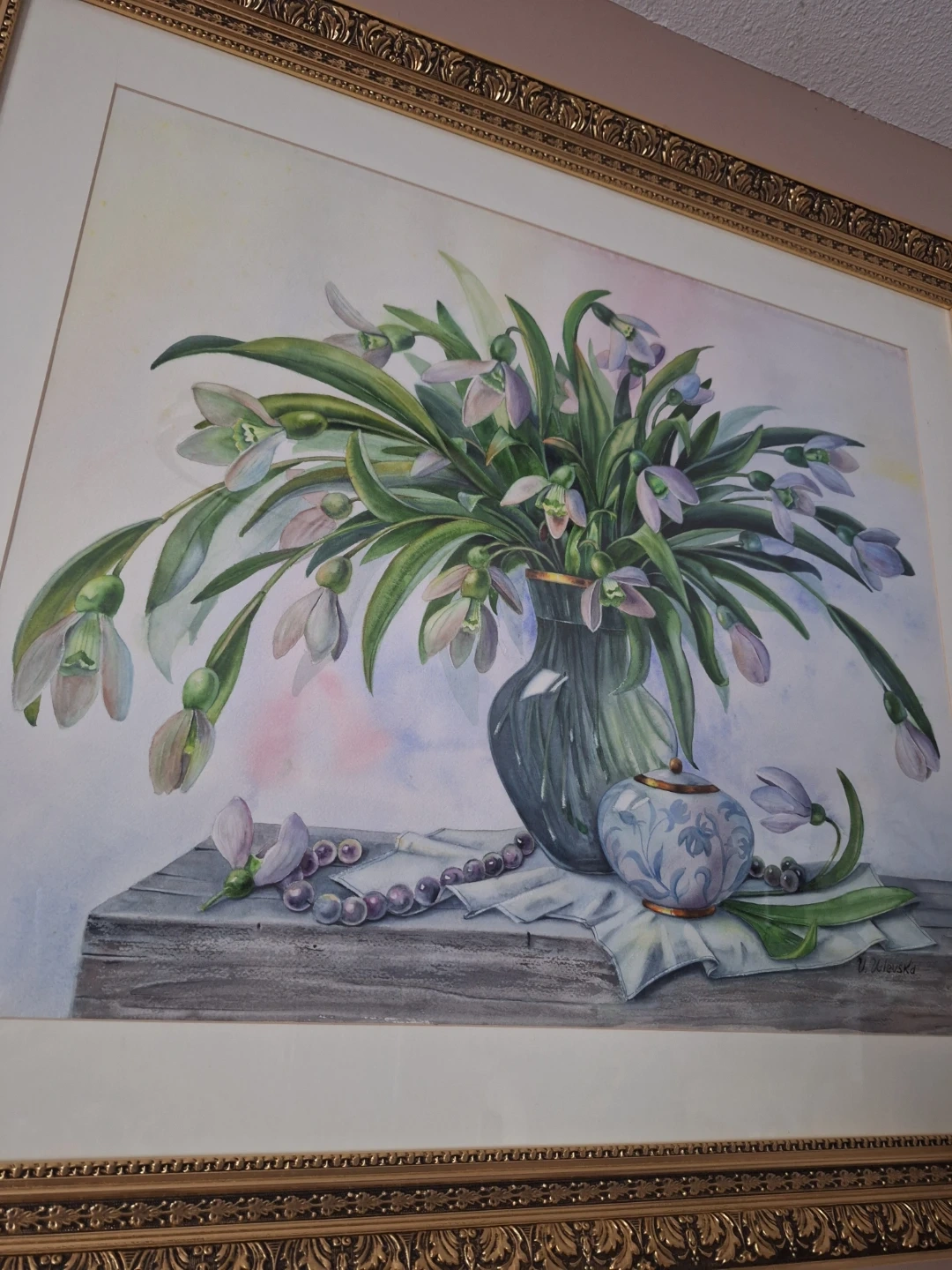 A beautiful floral still life painting, perfect for adding a touch of elegance to any room. The painting features delicate snowdrop flowers in a vase, accompanied by a decorative jar and beaded necklace. The artist's signature, V. Valevska, is visible in the corner. Original comes with the frame.