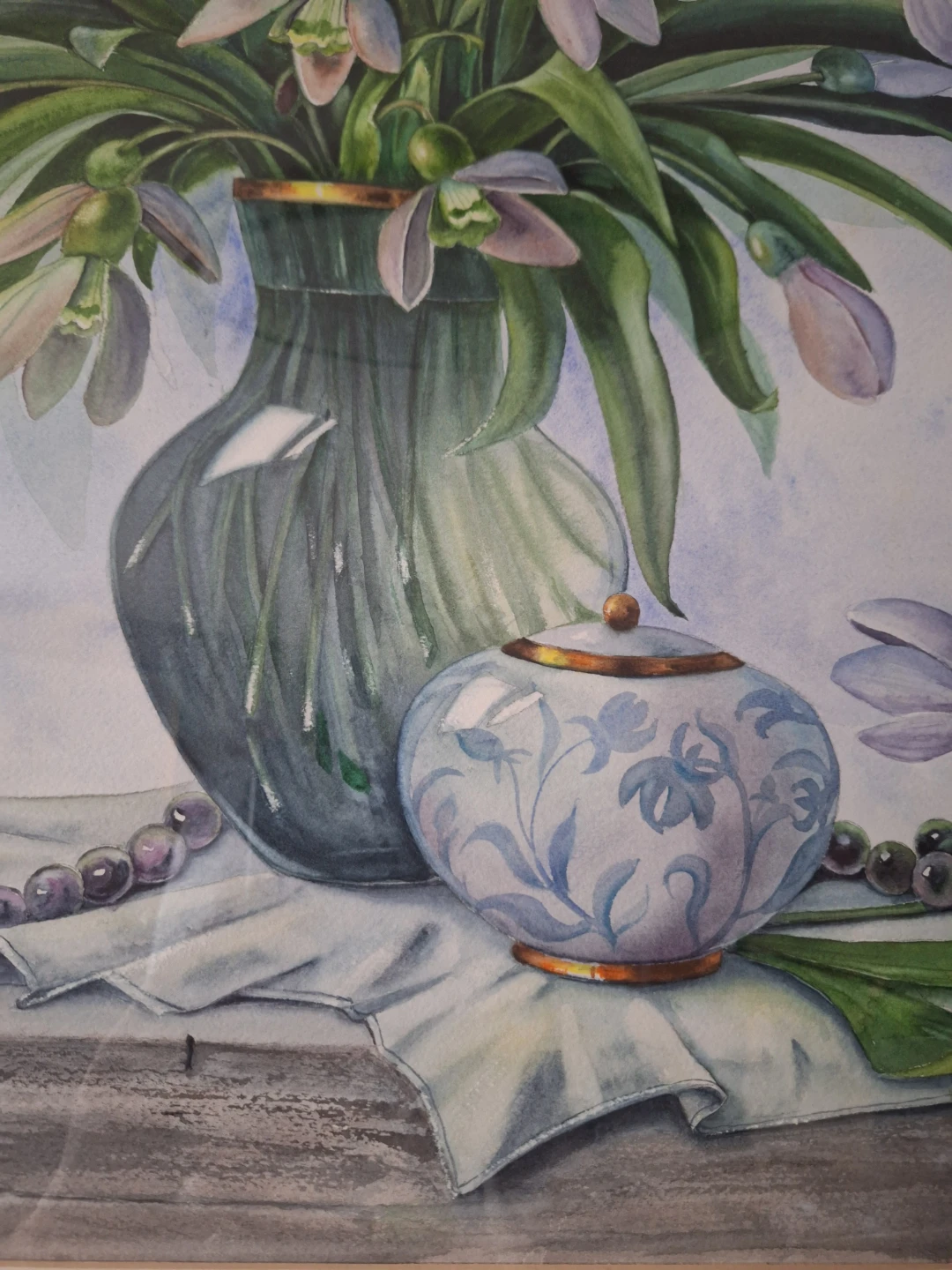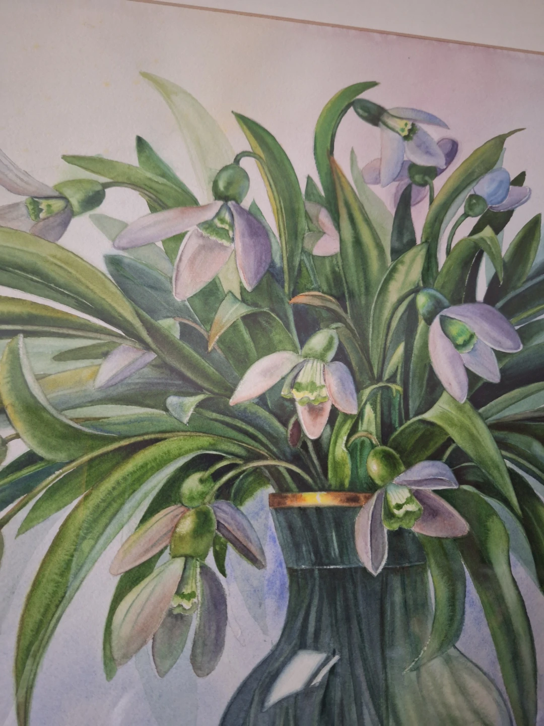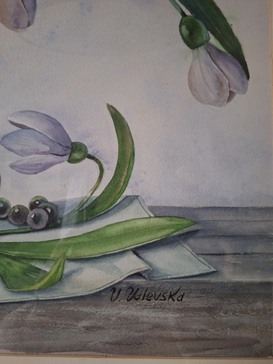 A beautiful floral still life painting, perfect for adding a touch of elegance to any room. The painting features delicate snowdrop flowers in a vase, accompanied by a decorative jar and beaded necklace. The artist's signature, V. Valevska, is visible in the corner. Original comes with the frame.