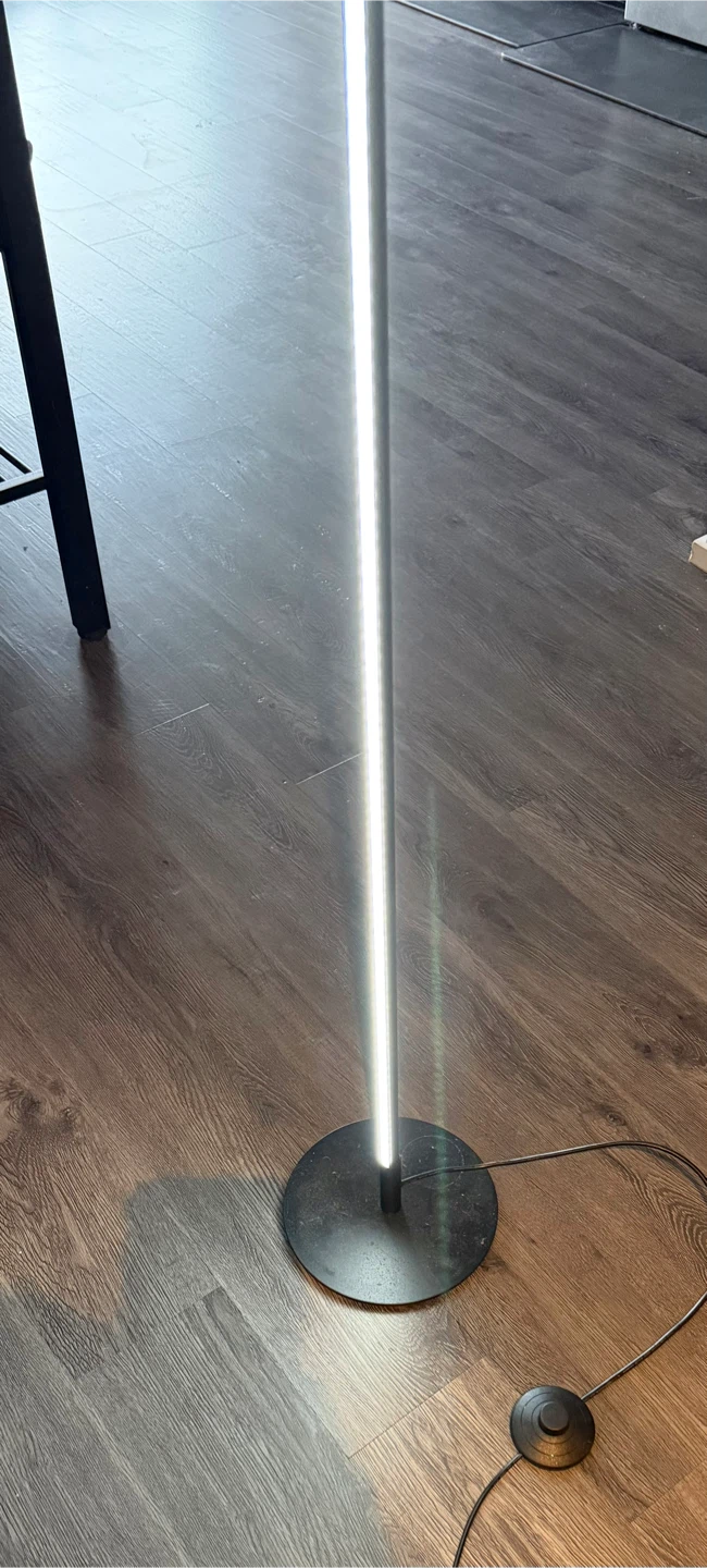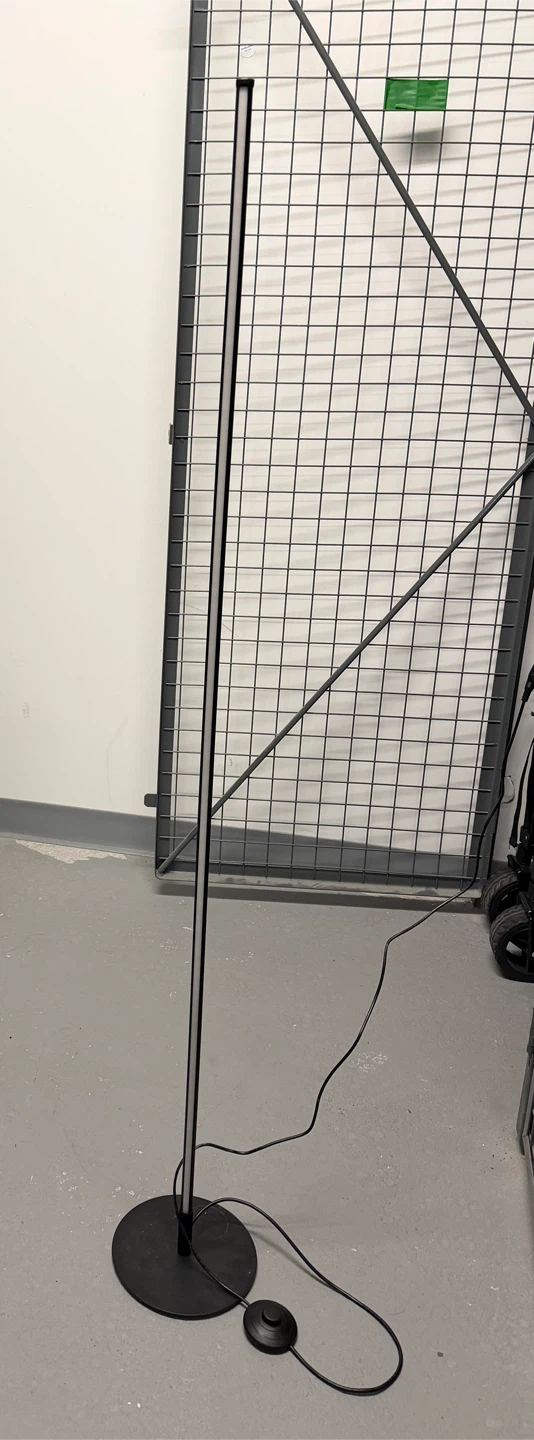 Modern LED floor lamp in black! It has a sleek and minimalist design that would look great in any room. It's in good condition and ready to brighten up your space