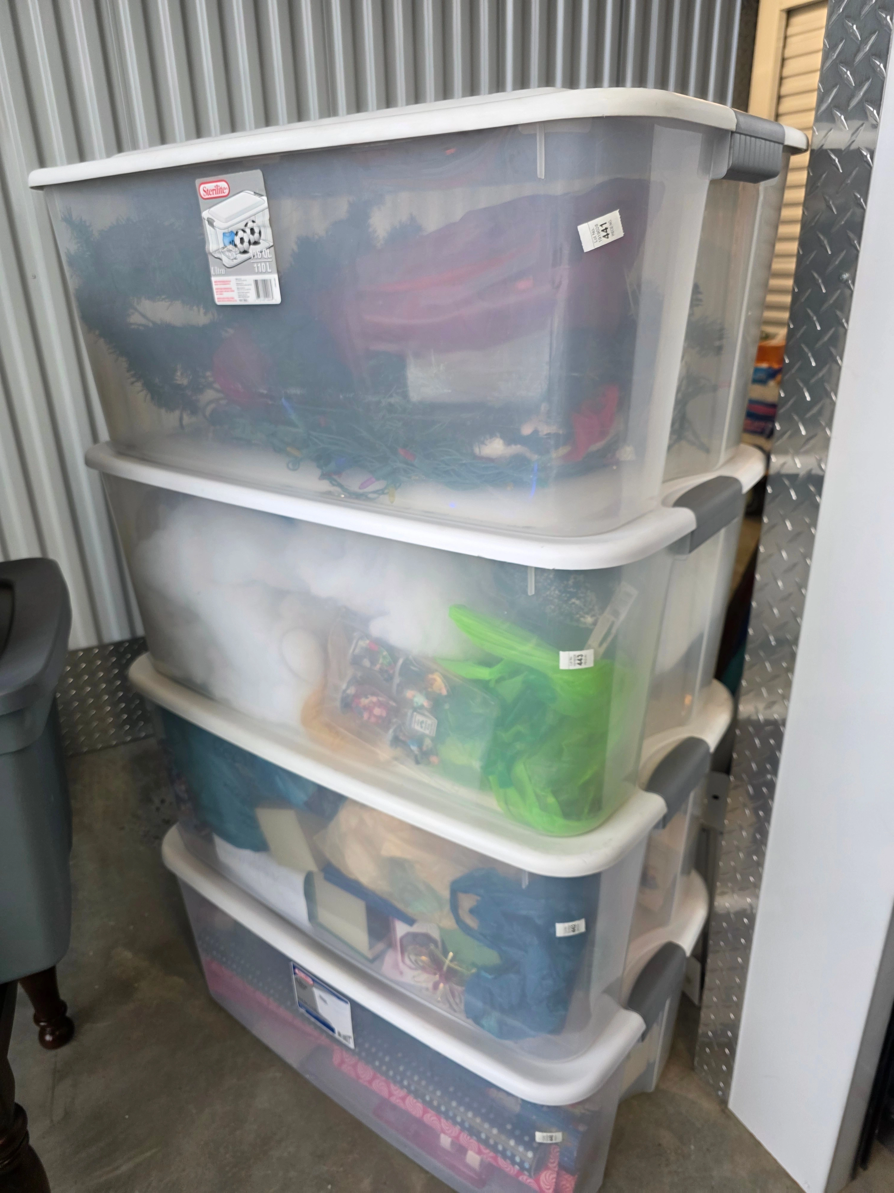 This is a large holiday dΓ©cor collection stored in four (4) large 100-litre totes, packed with quality Christmas decorations. Perfect for decorating a full home, setting up a Christmas village, or adding to your existing collection.