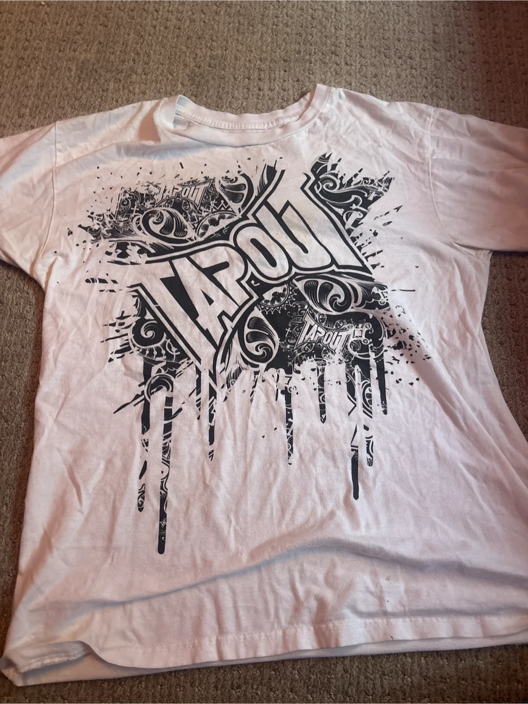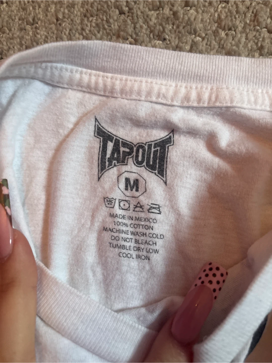 Selling a Tapout t-shirt in size medium. It's white and made of 100% cotton. The care instructions are: machine wash cold, do not bleach, tumble dry low, and cool iron