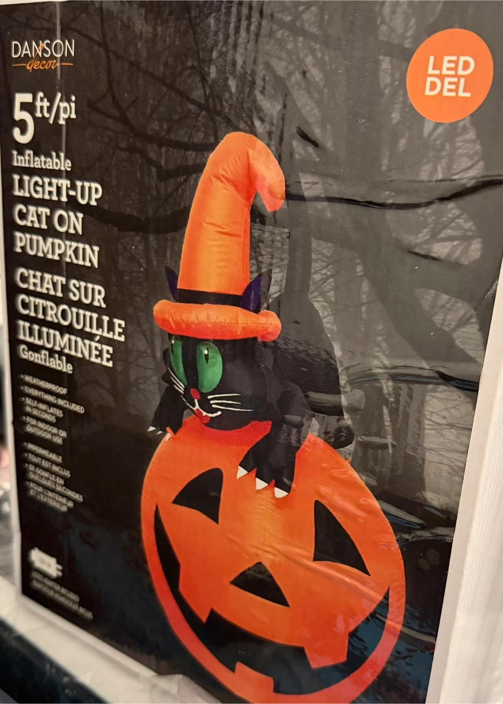 Get ready for Halloween with this fun inflatable decoration! It's a Danson Decor 5ft inflatable light-up cat on a pumpkin. It's weatherproof and includes everything needed for setup. It self-inflates in seconds and is suitable for both indoor and outdoor use