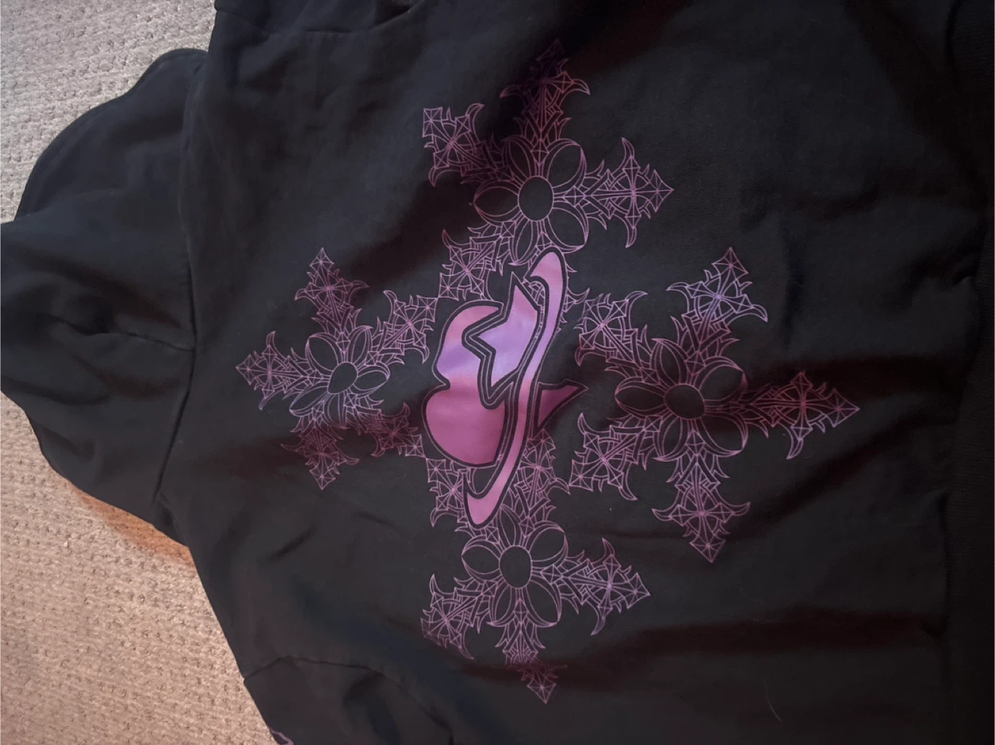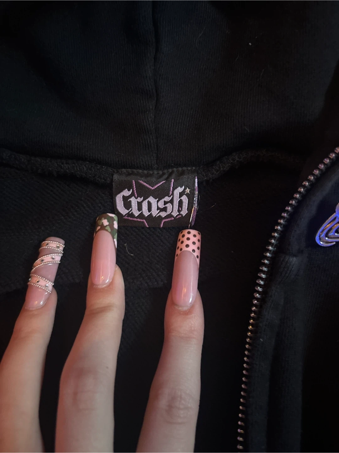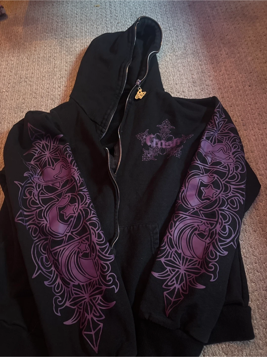 Selling a black zip-up hoodie from Crash! It has a really cool design on the back and sleeves in purple. The hoodie is in great shape and ready for a new owner!