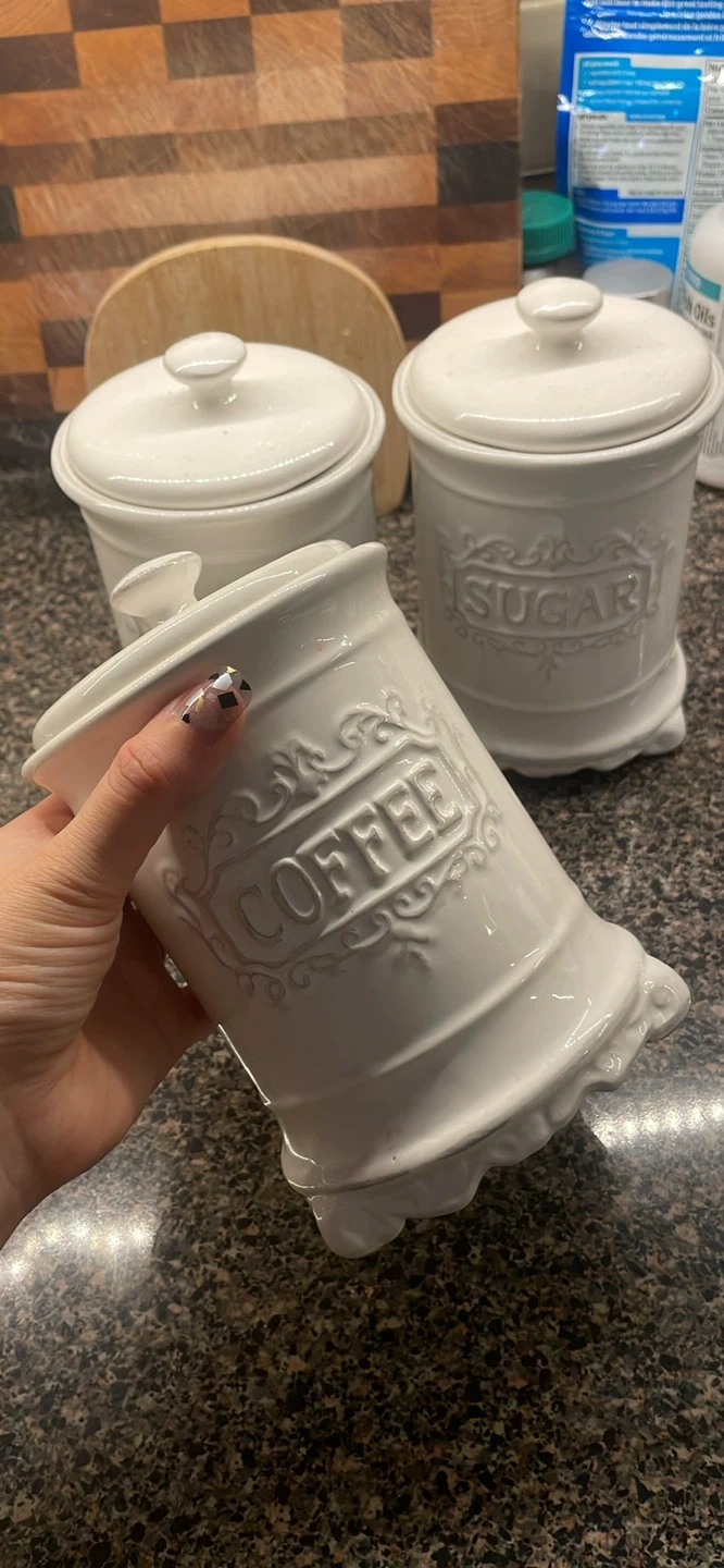 Selling a set of three white ceramic canisters for coffee, tea, and sugar. These are in great condition and would look lovely in any kitchen! They have embossed labels for easy identification.