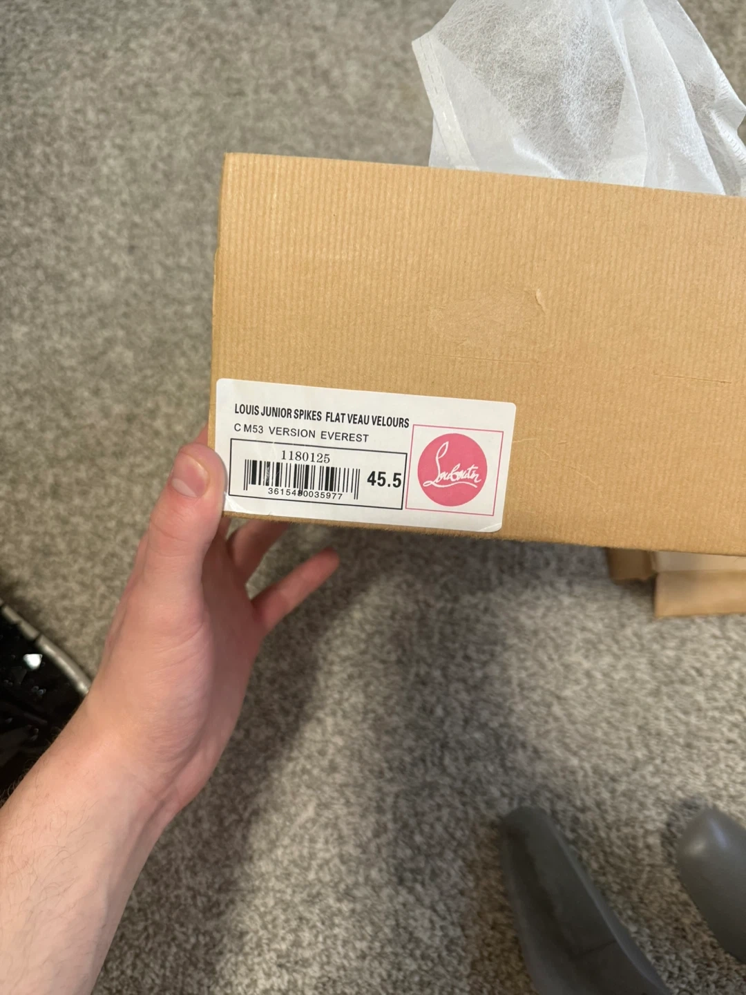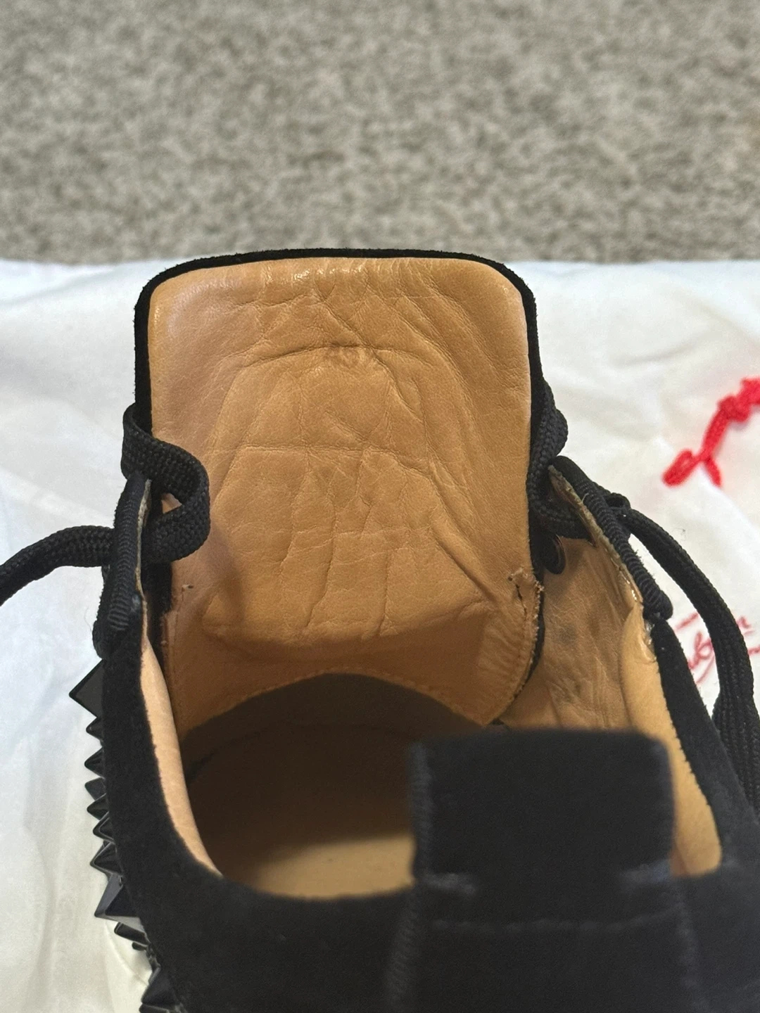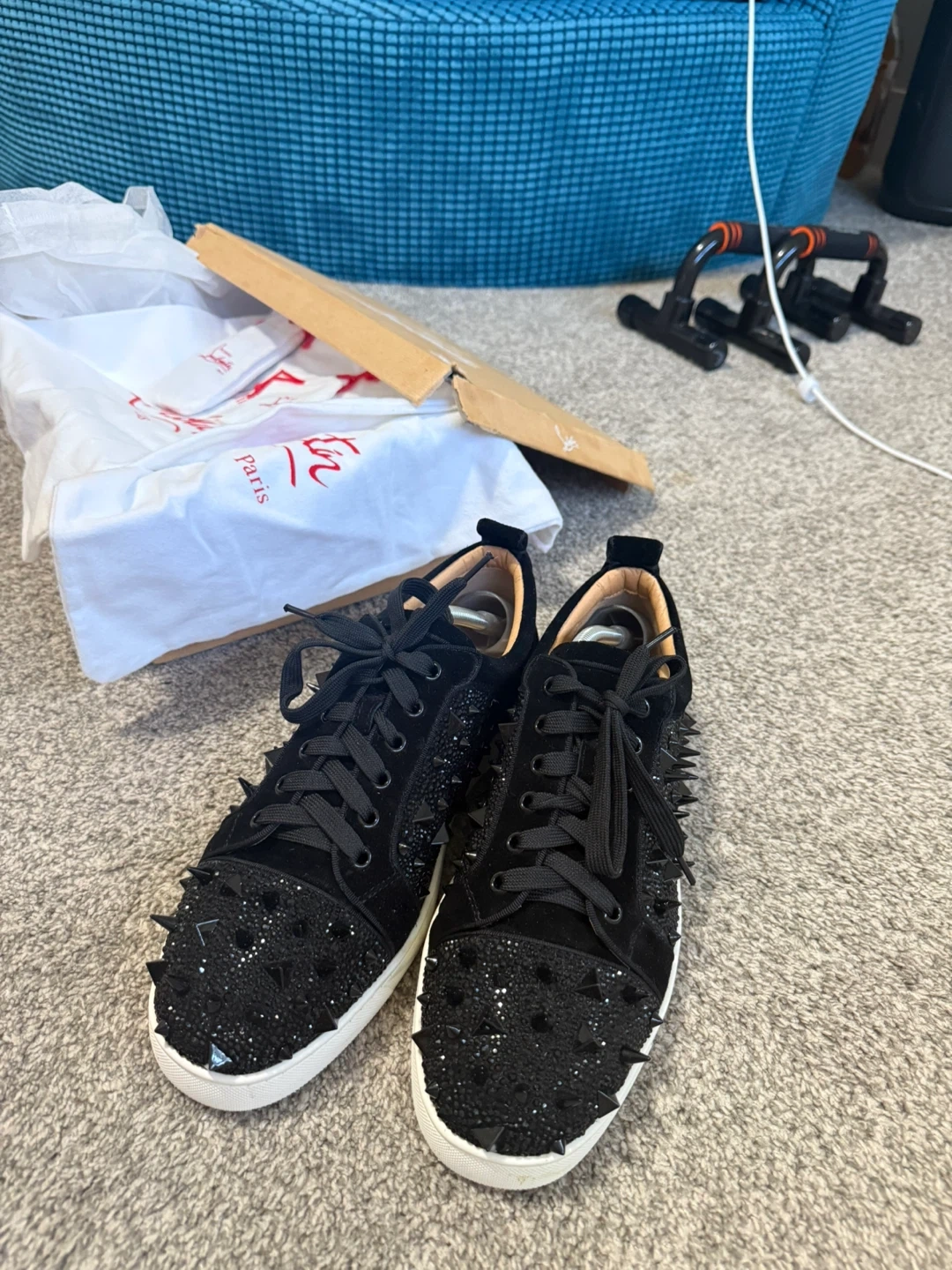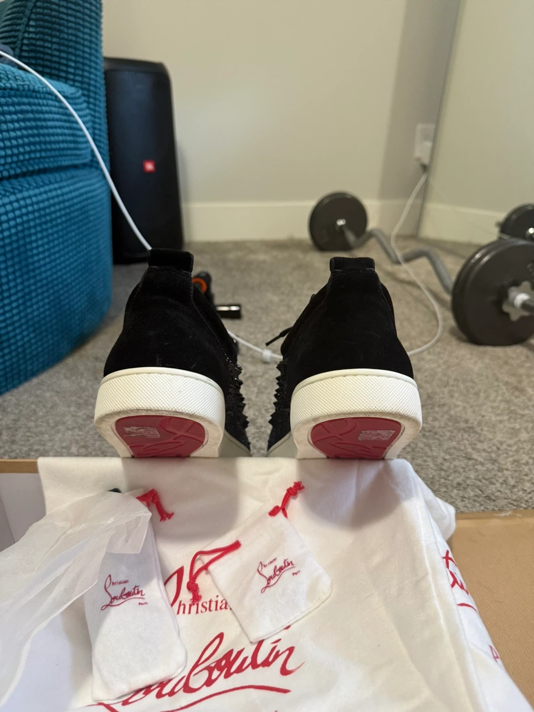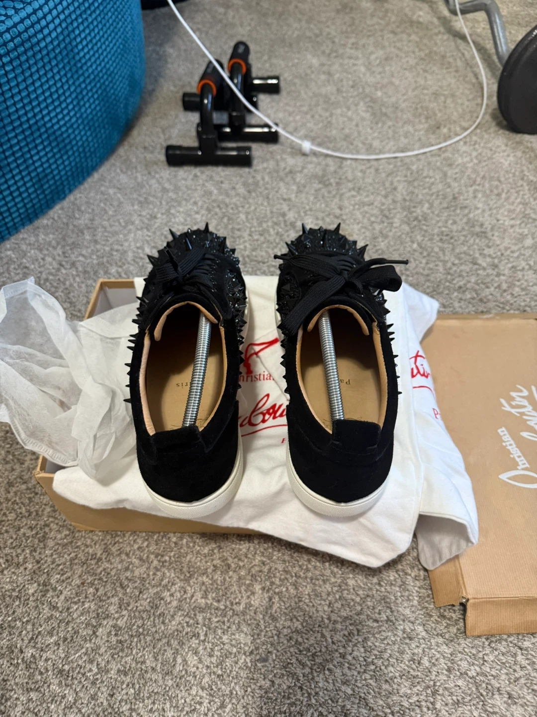 Selling a pair of Christian Louboutin black spike sneakers. They come with the original box and dust bags. The soles are the signature Louboutin red. These shoes are immaculate, only worn to grad once 5 years ago. Size 45.5, so a us 11.5. I’m size 11 and I’m able to wear comfortably small bit of wiggle room at the toes, but not excessive. Top lid of box came off while moving and got flattened, but that would be the only flaw. Message for more info if need be.
