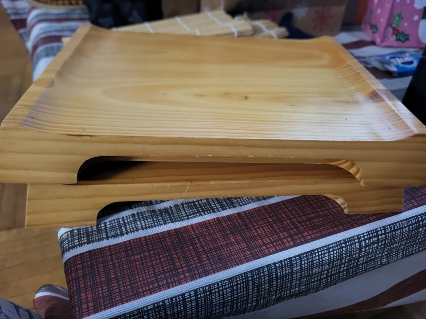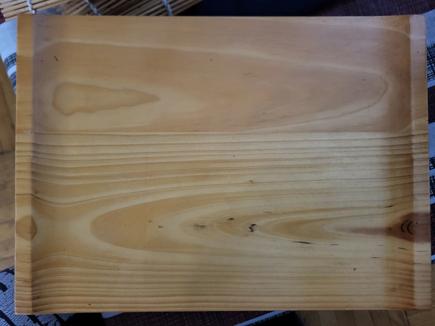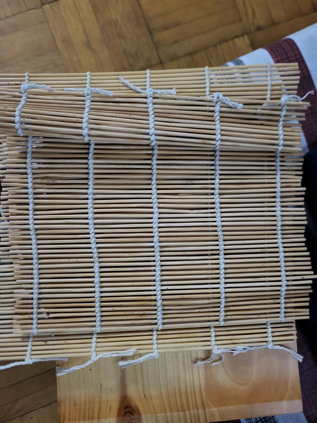 Selling a wooden sushi serving tray and a bamboo rolling mat. They are in good condition and ready for your next sushi night! The tray is made of wood, and the mat is made of bamboo.