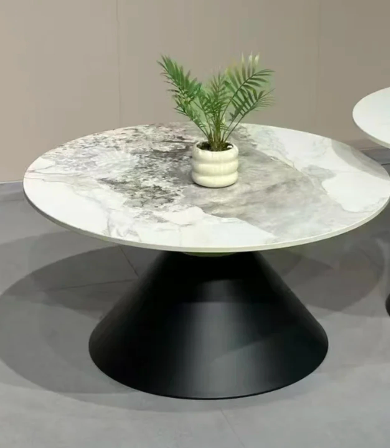 Selling a round coffee table with a marble style top and a black conical base. It's in new condition 700×425mm(h)
