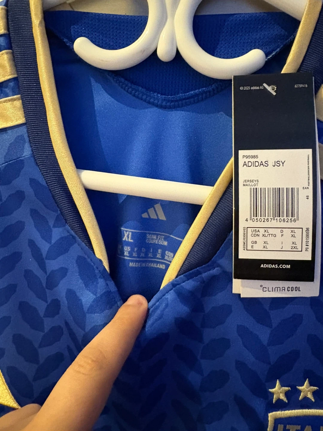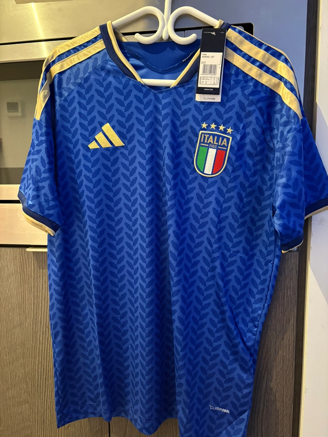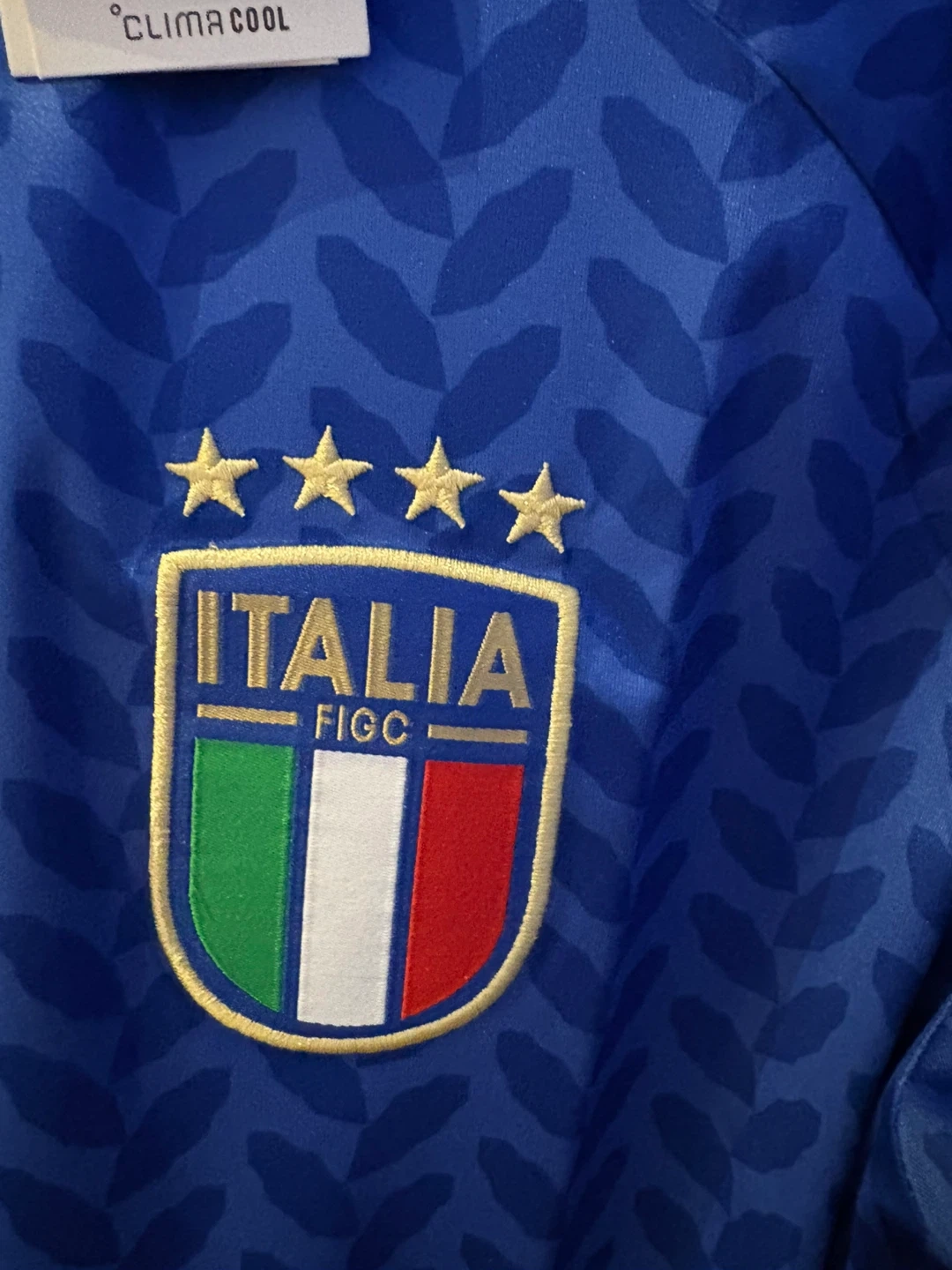 Selling an Adidas Italy soccer jersey in blue! It features the Italian flag emblem and Adidas logo. The jersey has a stylish leaf pattern and gold accents on the shoulders and collar.