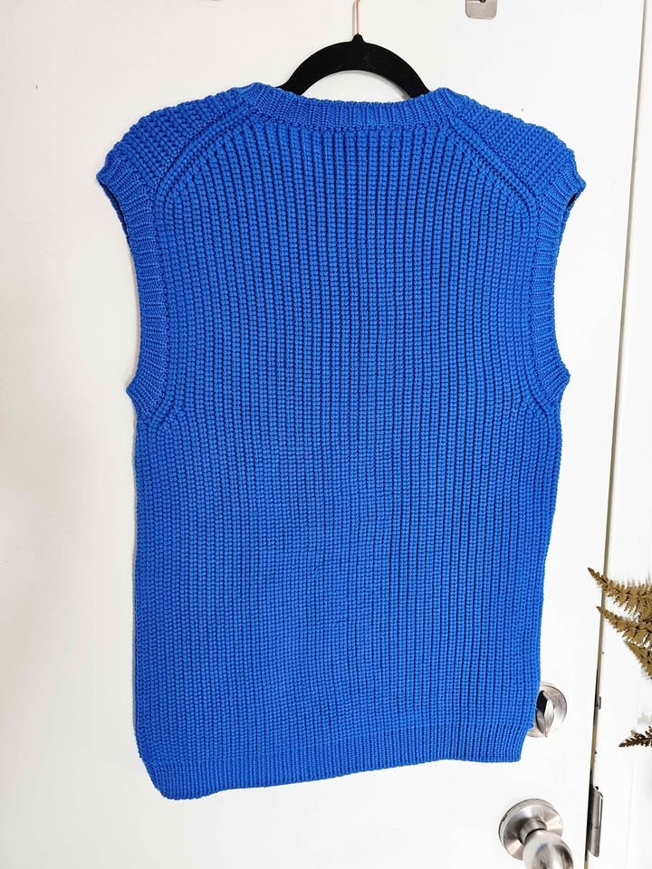 Marni chunky sculptural knit sweater vest in a rich saturated cobalt blue. Made in Italy. Clean V-neck style and sleeveless cut reflect Marni’s utilitarian-modern experimental style, with bold color and texture. Fabric is 100% polypropylene. Vest is a boxy women's style but can easily work for unisex looks.