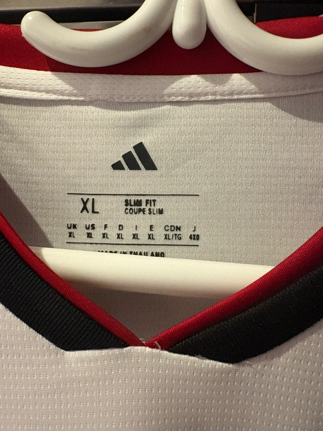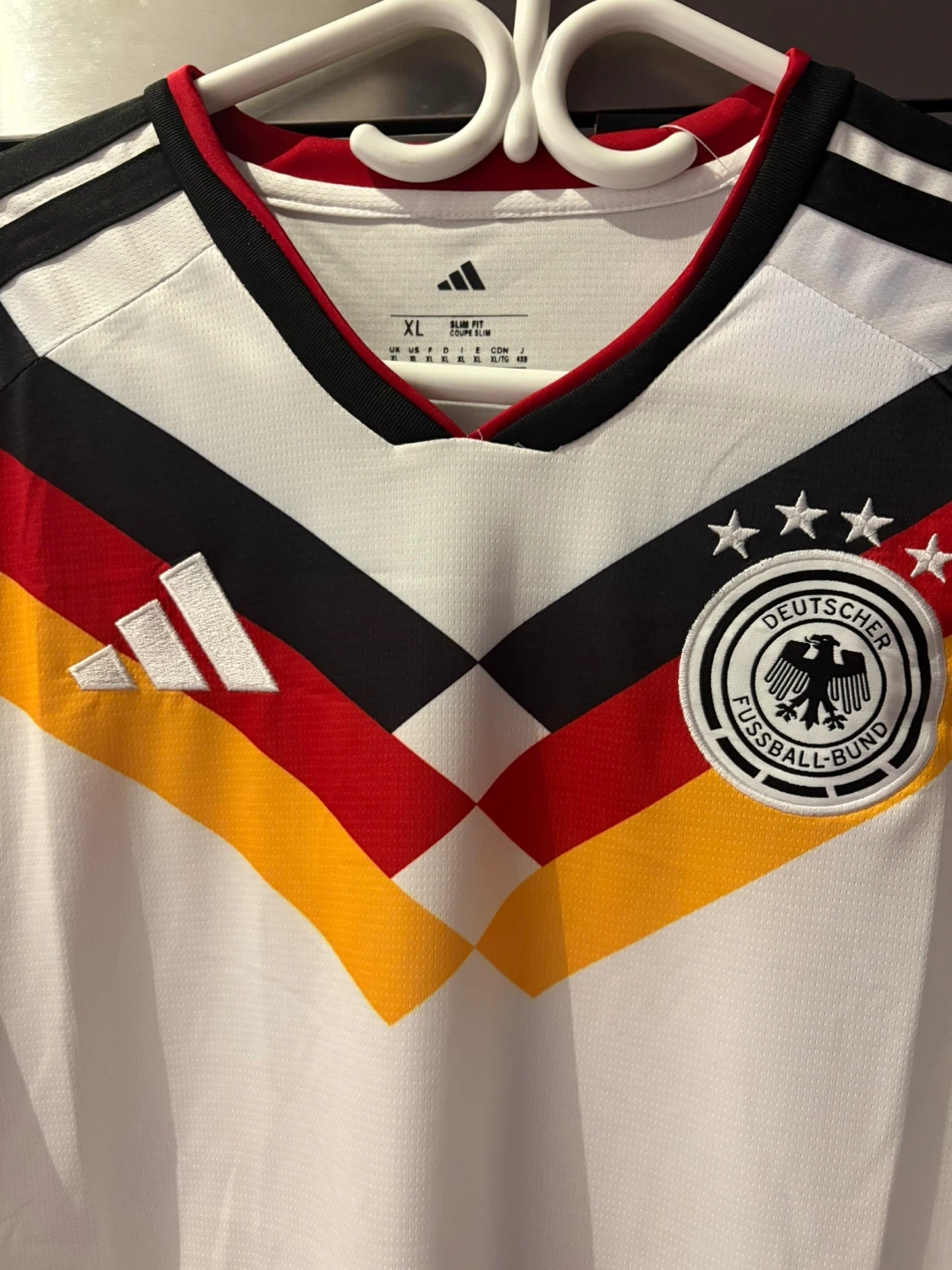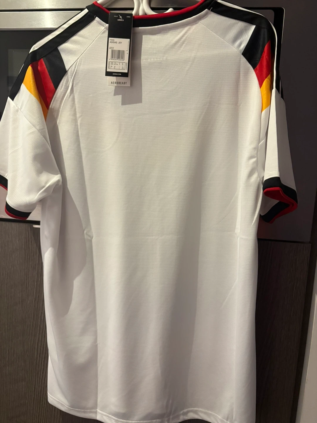 Selling an Adidas Germany soccer jersey. The jersey features the Deutscher Fussball-Bund logo and the iconic Adidas stripes. Perfect for any soccer fan!