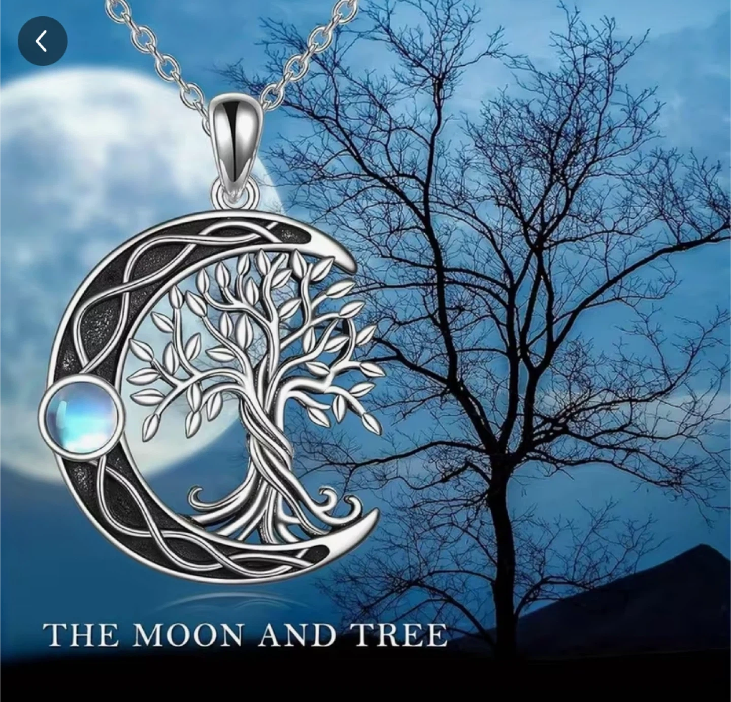 This is a beautiful pendant necklace featuring a crescent moon with a tree of life design inside. It has a silver chain and a moonstone accent