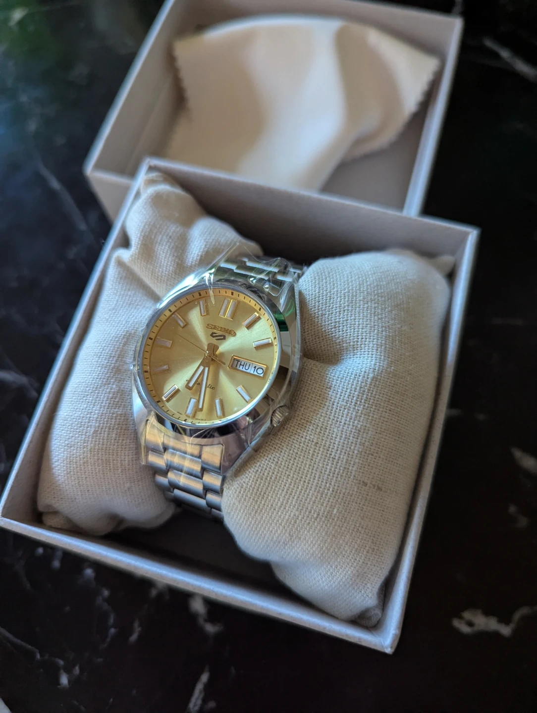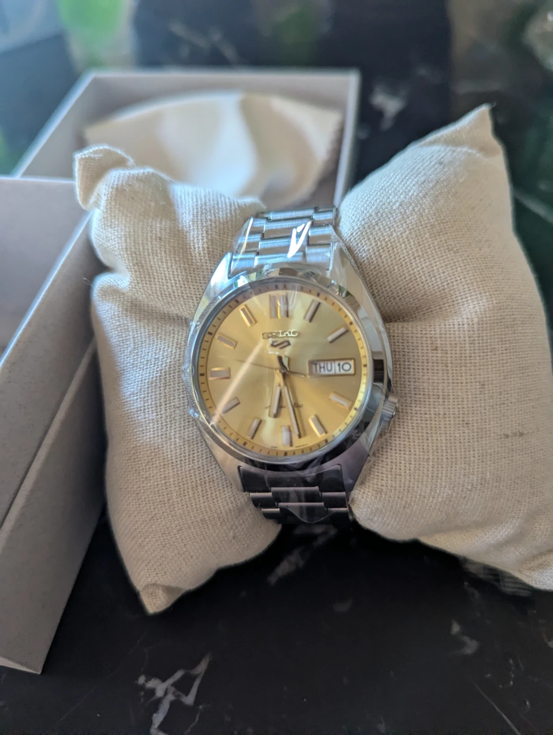 Brand new SEIKO SNSX watch with the gold coloured dial face, in the 37 mm size .Extra links to expand the bracelet.