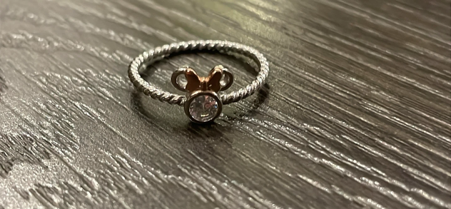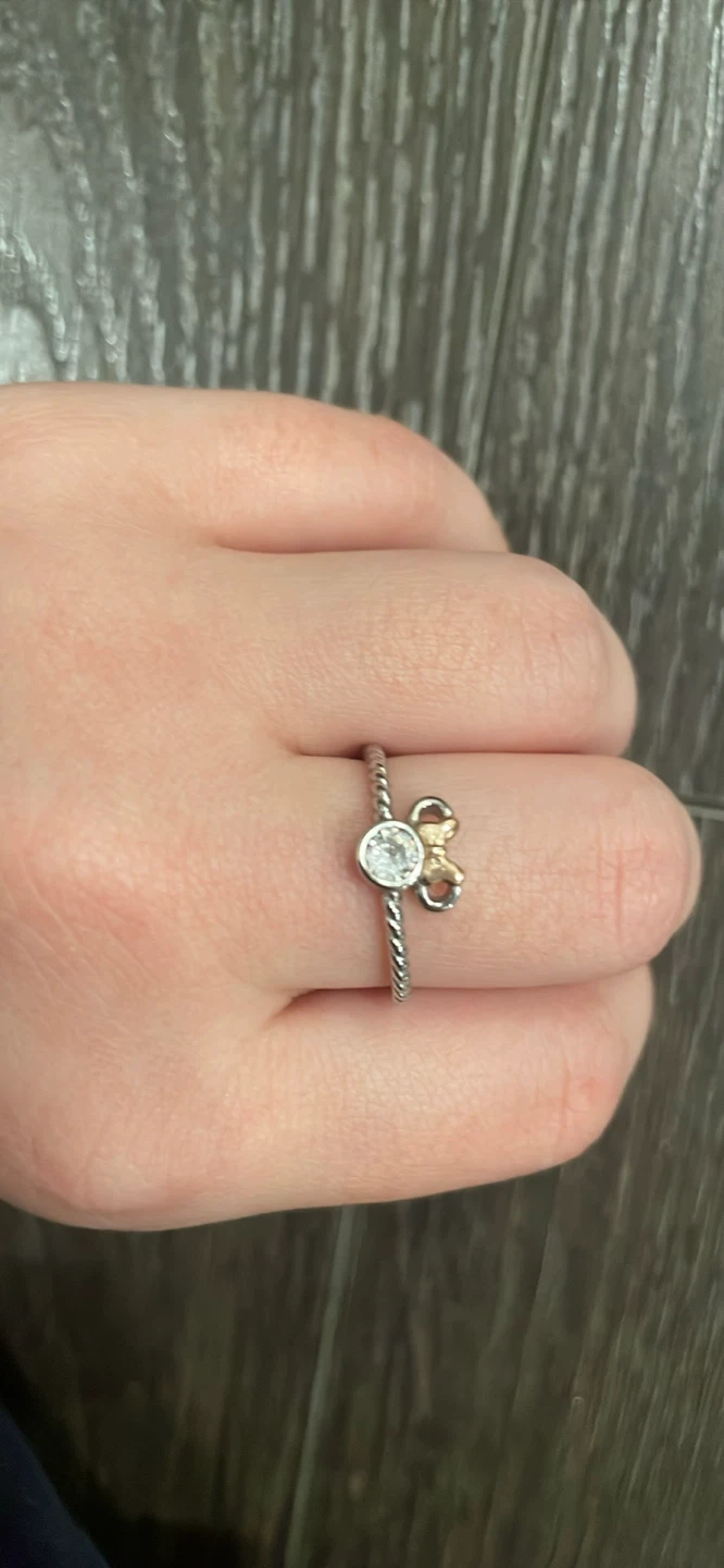 Selling a Pandora Disney Minnie Mouse ring. It's in great condition and ready for a new owner! The ring features a silver band with a Minnie Mouse design in gold and a clear stone accent.