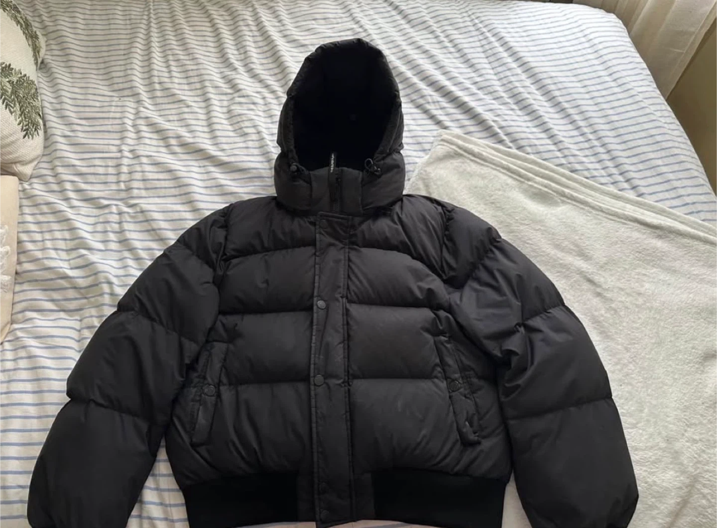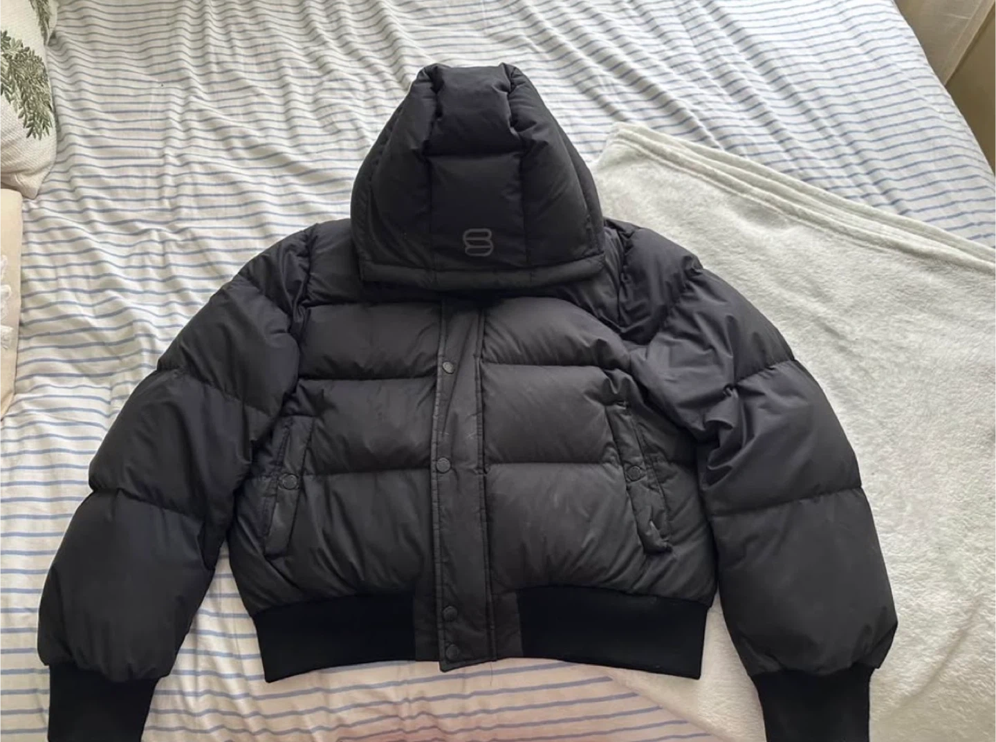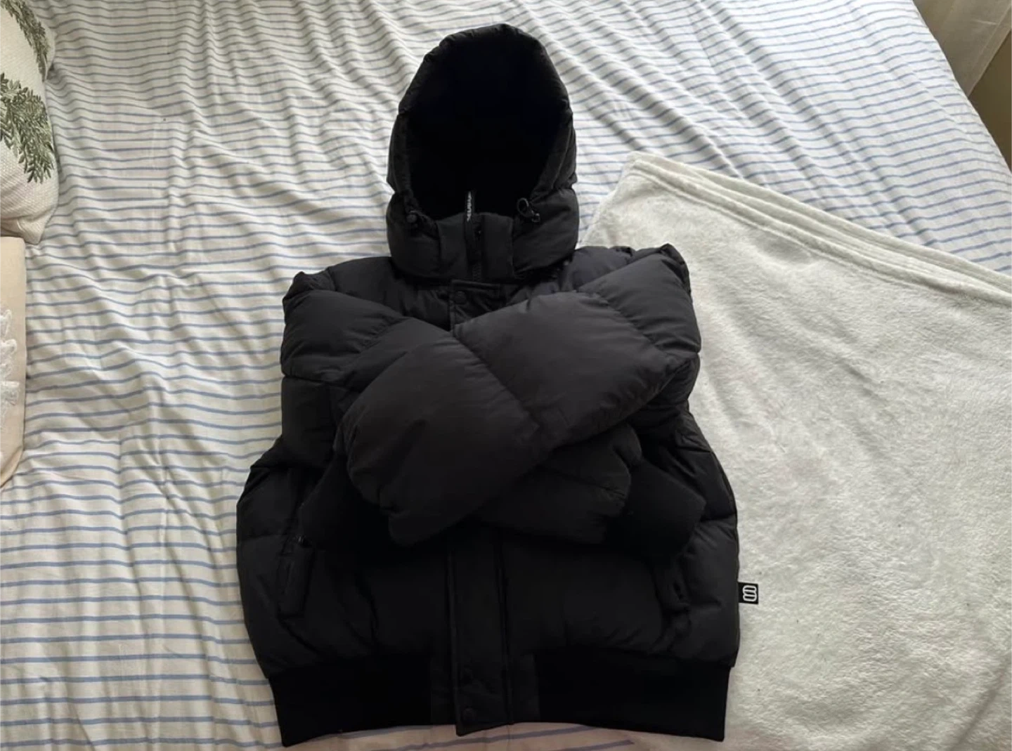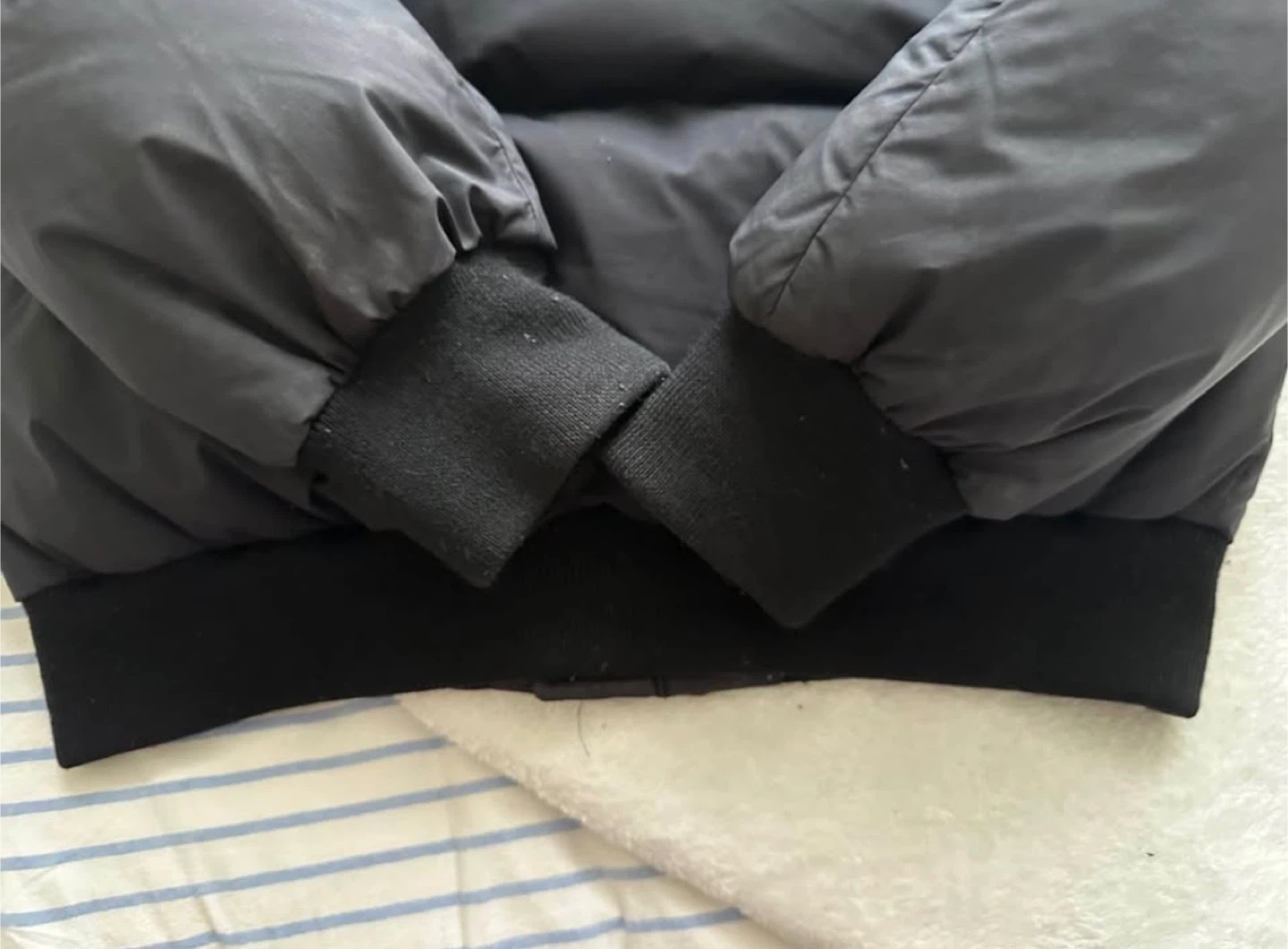 Has been worn for a winter. Almost no pilling on the material, sleeves and bottom of jacket. In super clean condition and keeps you extremely warm (coming from a canadian girly).