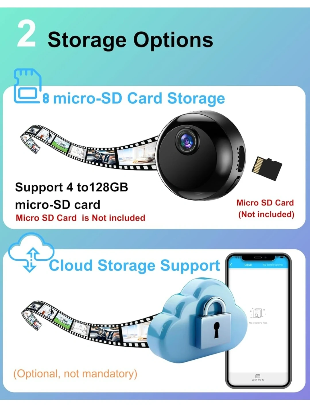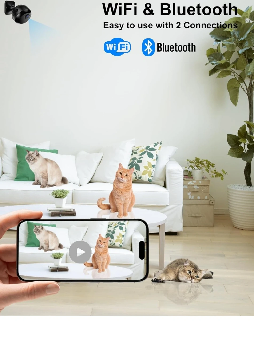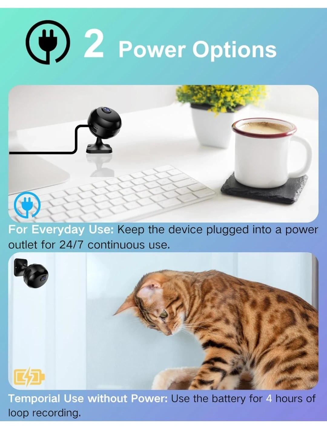 【Quick Setup with 2.4G Wi-Fi 】: Supports 2.4G Wi-Fi Connection. For easier setup, this mini camera also supports use Bluetooth to setup camera, only needs 1 minute to finish setup camera. *Note: This wifi indoor camera only support 2.4G wifi, not 5G. 【1080P HD & Night Vision】 : 1080P HD Live video streaming, allow you to check your home/pets/family anywhere via app. This mini wifi camera can auto into night vision mode when it gets dark around. 【Motion Detection】: Smart motion sensor detect human and pets movements quickly, send alerts to your phone instantly, the events will be saved in app for 48 hours for checking. 【2 Power Options】: This rechargeable wifi camera has 1000mAh built-in battery. For 24/7 continous recording, keep the camera plugged in via power cable. For No-power location, the camera can keep loop recording video for 4 hours.