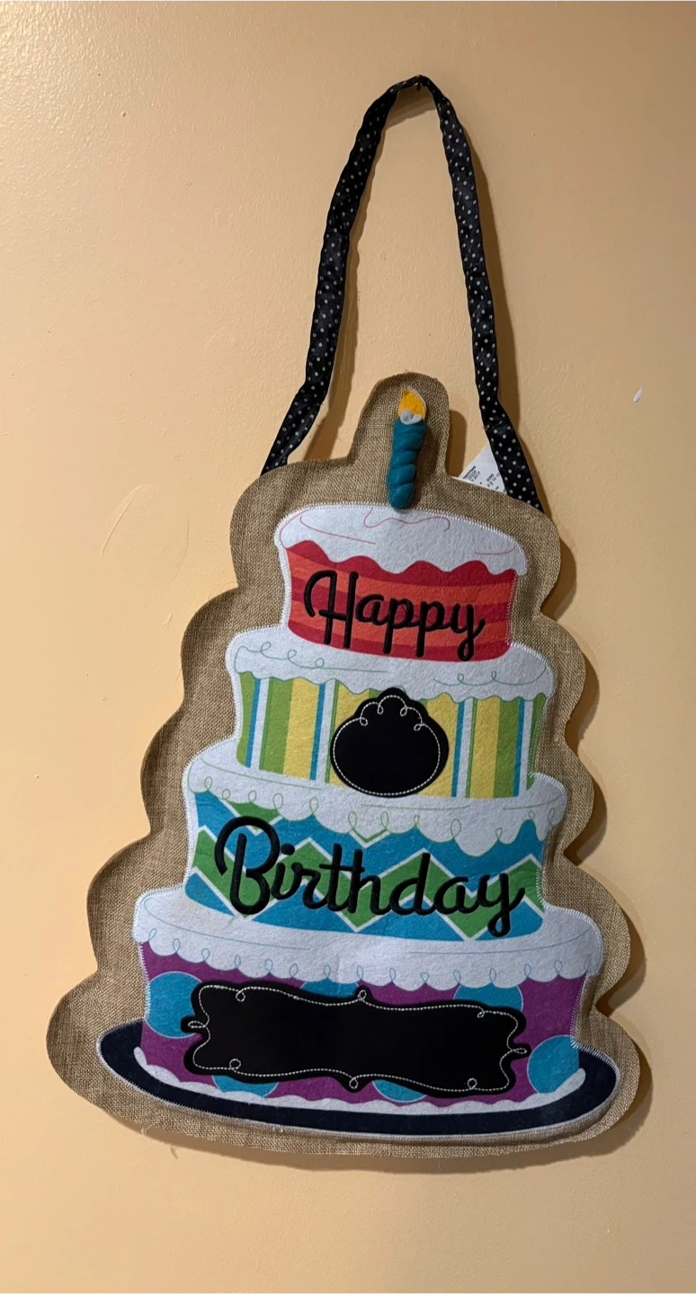 Add some fun to your next birthday party with this adorable cake Door Or wall decor! It features a colorful, three-tiered cake design with the words "Happy Birthday" written on it. Perfect for adding a festive touch to any room.