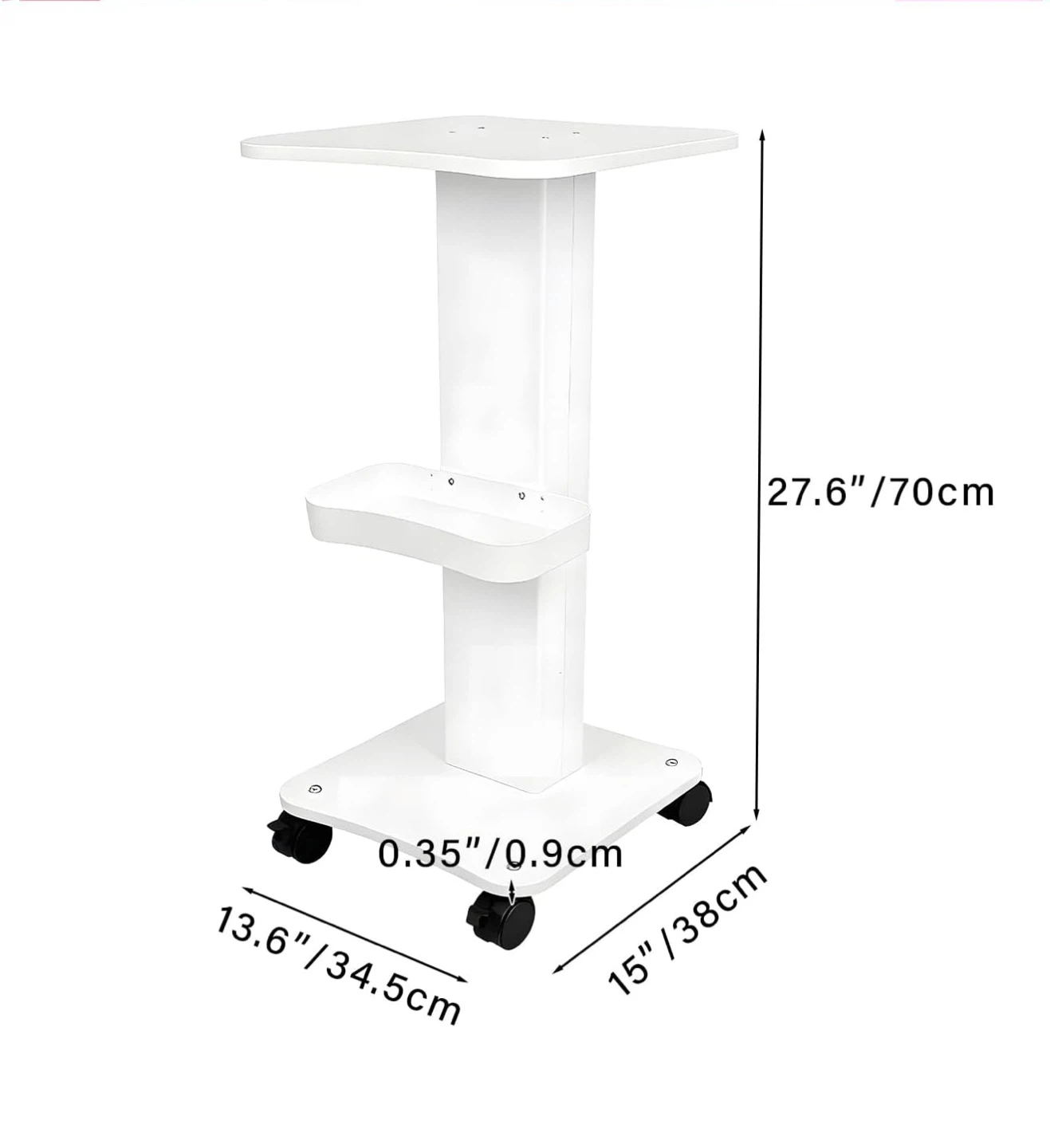 This is a rolling beauty salon spa cart in white. It's in new condition and comes with the box and all components. The dimensions are 27.6"/70cm (height), 13.6"/34.5cm (width), and 15"/38cm (depth).