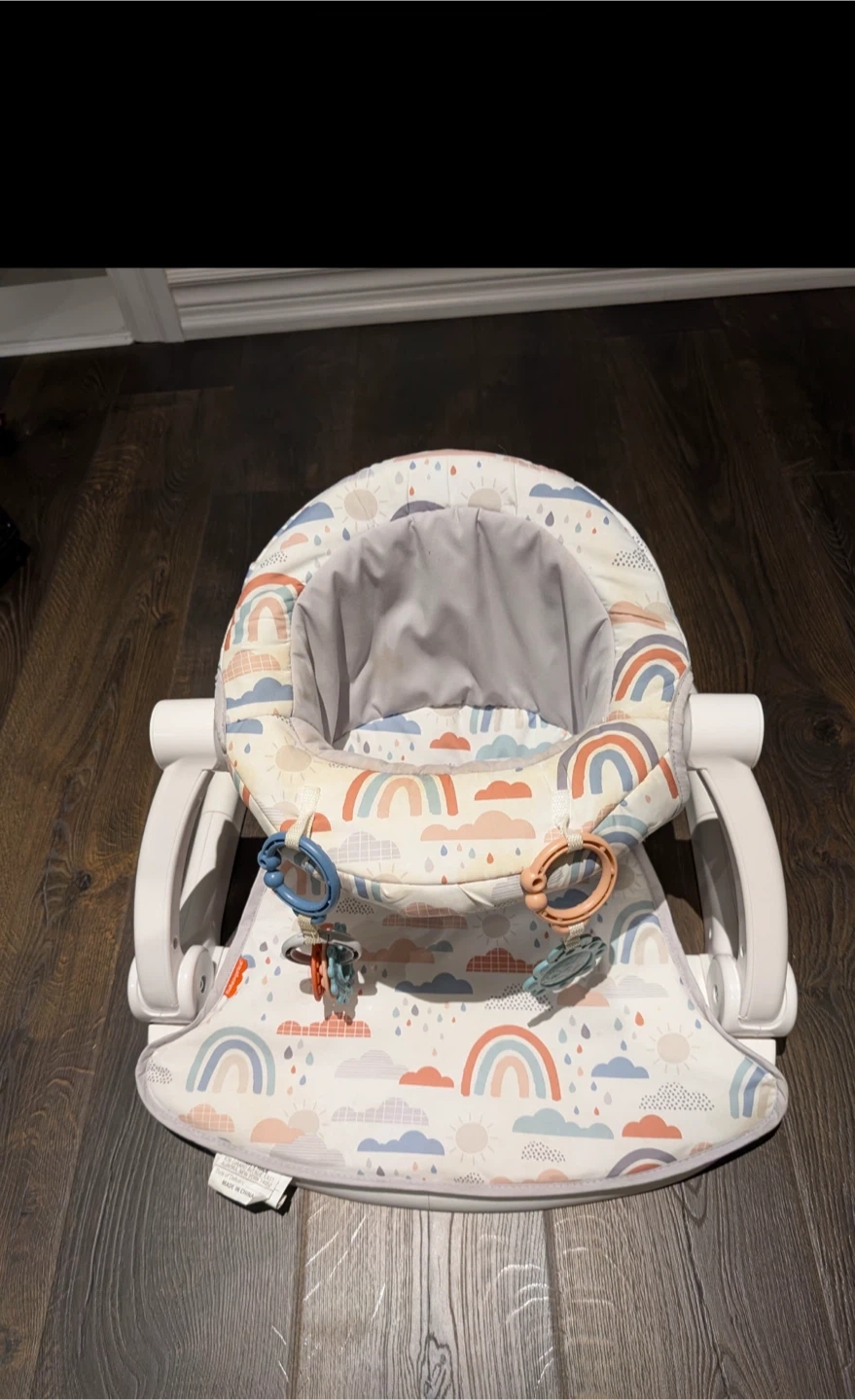Selling a Fisher-Price Sit-Me-Up Floor Seat! It's in good condition and ready for a new little one. The seat has a cute rainbow and cloud pattern and includes attached toys for baby to play with.