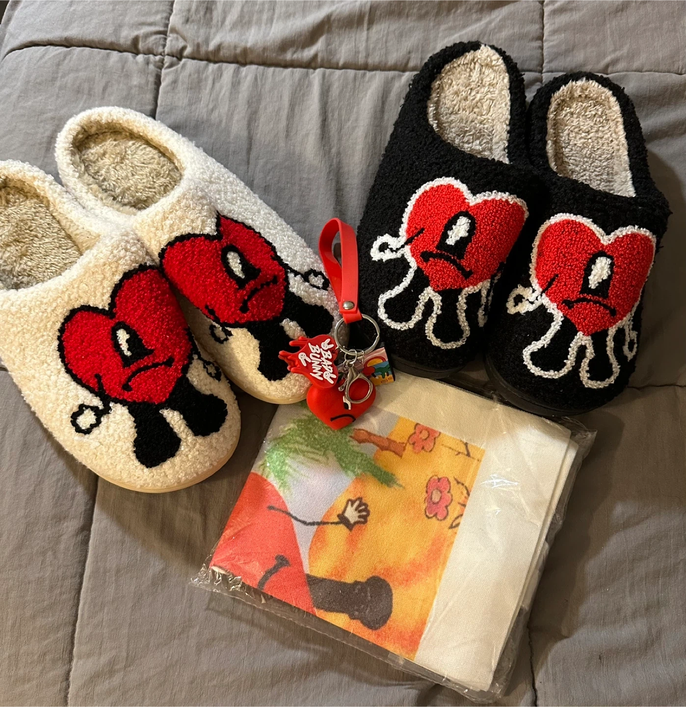 Selling a cute set of Bad Bunny slippers! You get two pairs, one black and one white. They are size 39-40. Also comes with a Bad Bunny keychain and a small tote bag with a Bad Bunny design! Pick up only .. East 106 and 1st ave! Firm!