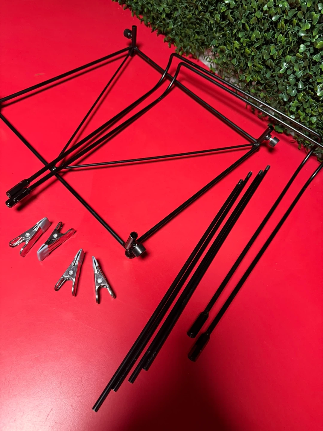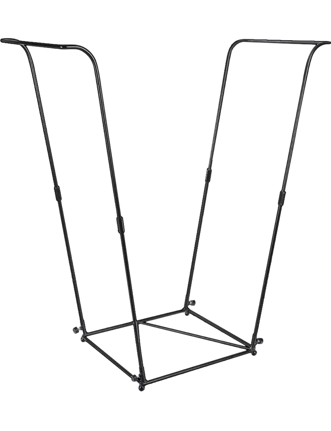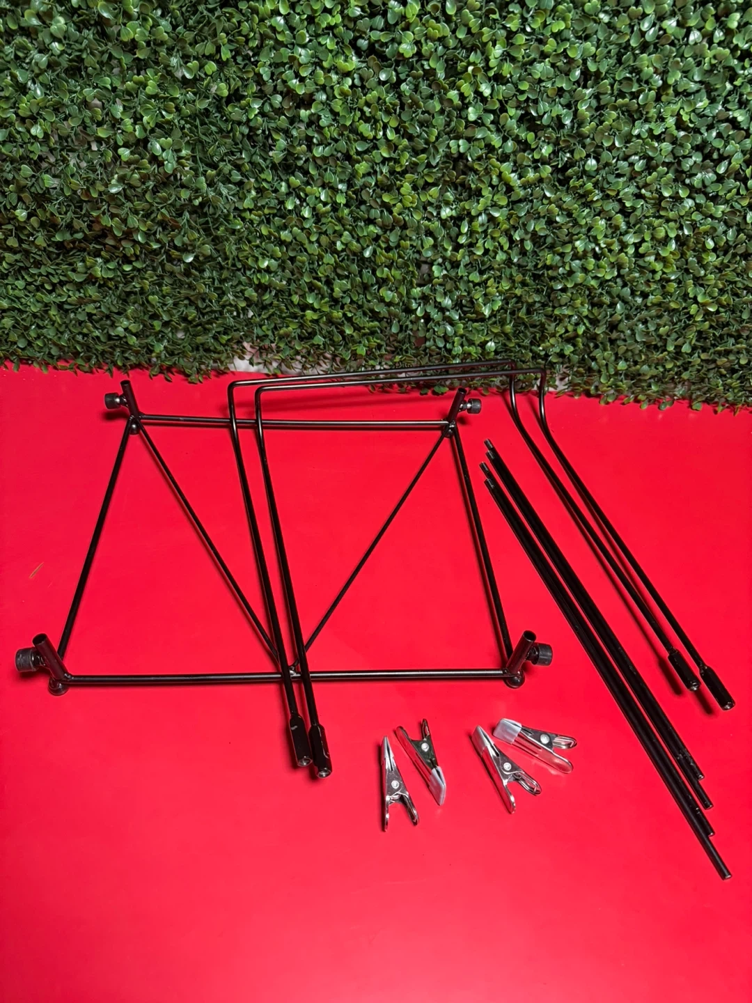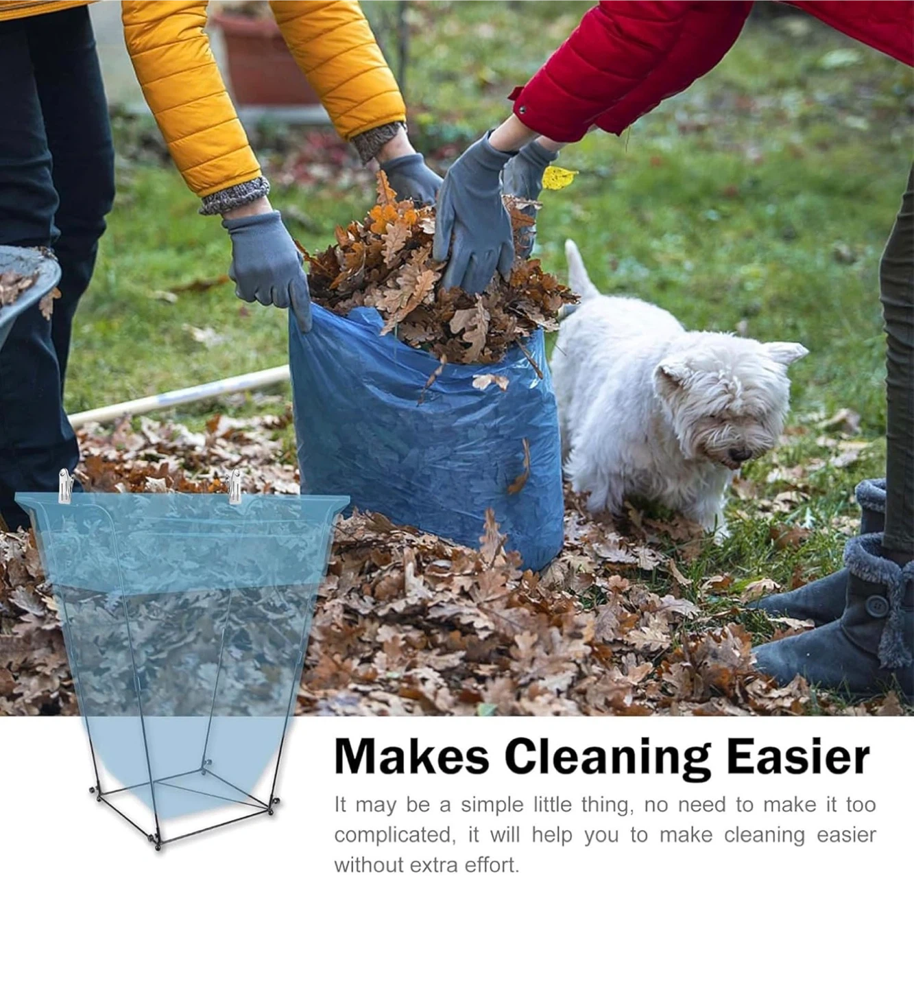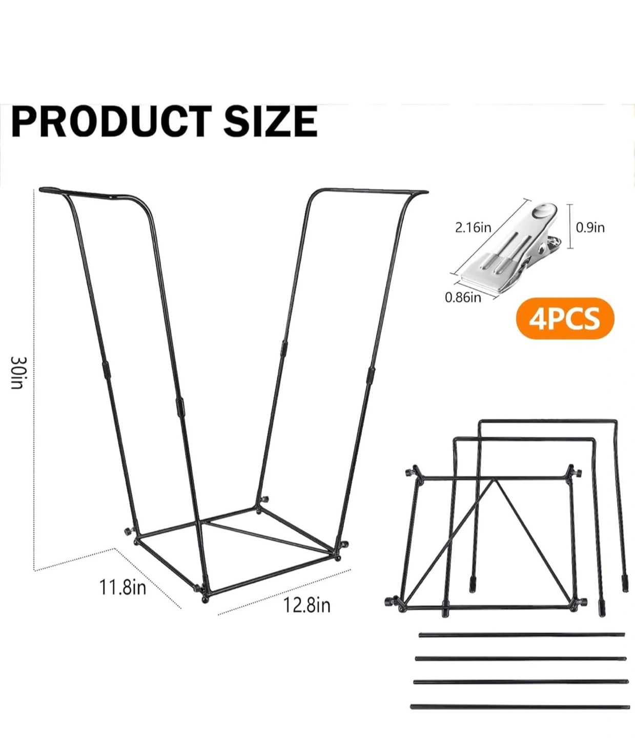 This is a portable leaf bag trash can holder. It is black and made of metal. The product size is 30 inches tall, 11.8 inches wide, and 12.8 inches deep. It also comes with 4 clips.