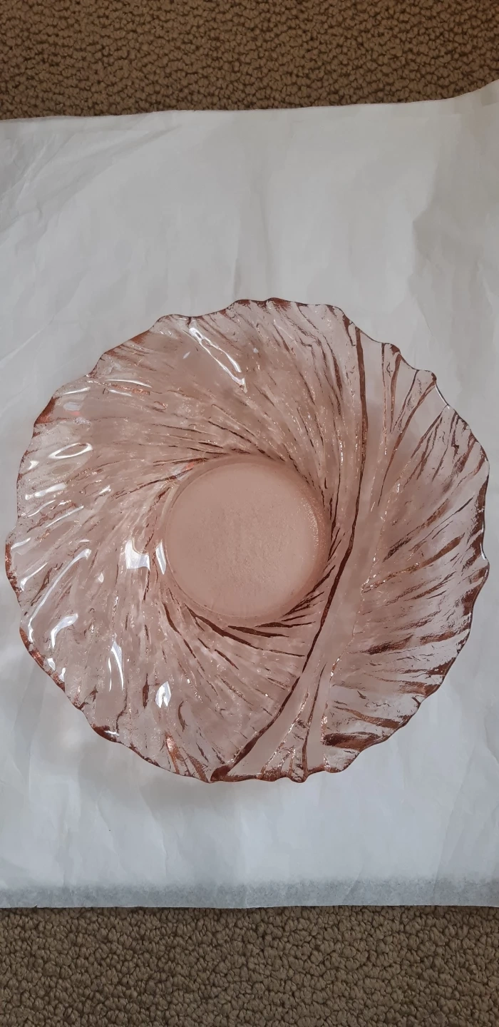 This is a lovely pink glass bowl with a unique textured design by Pertti Kallioinen.