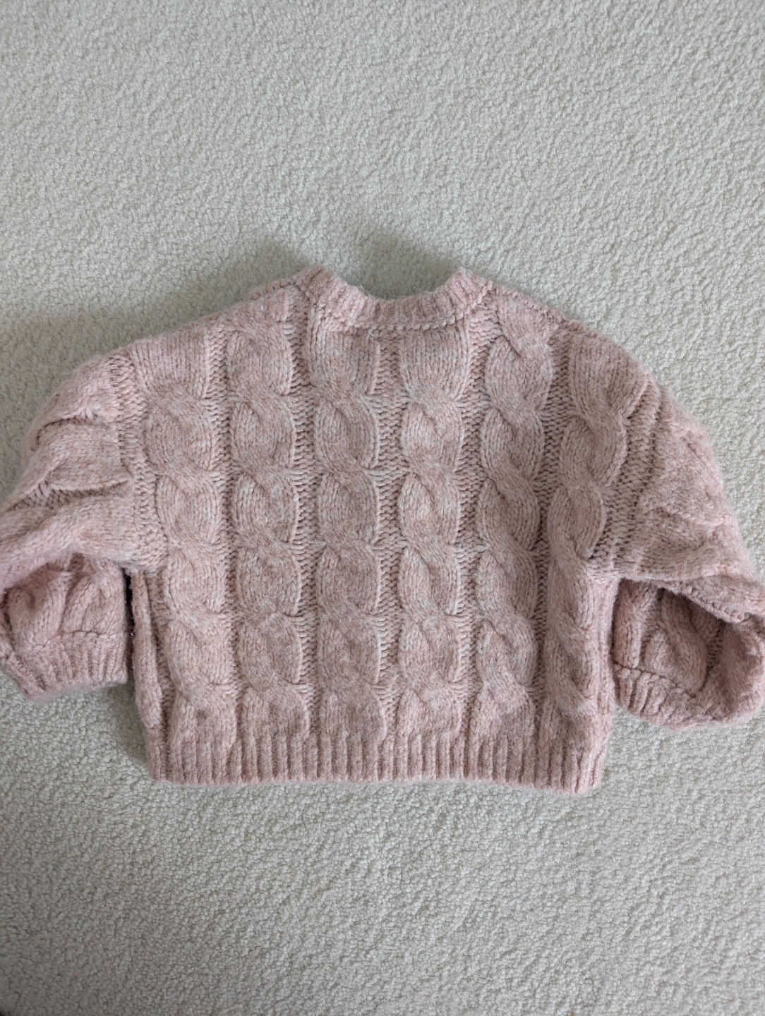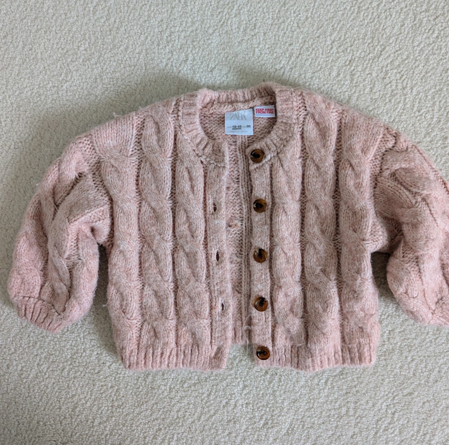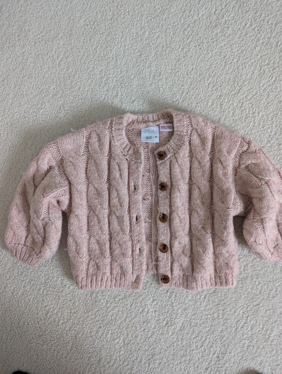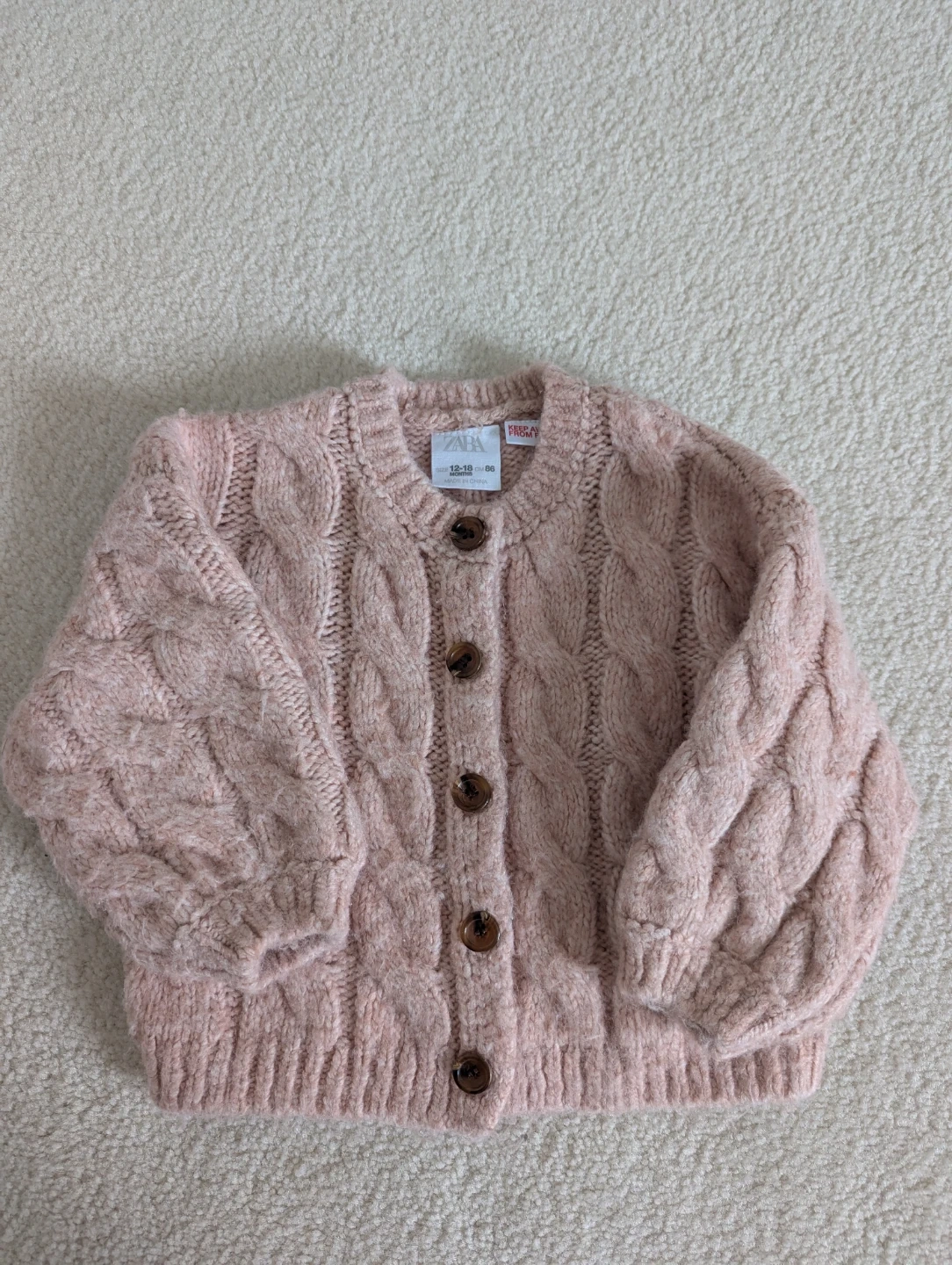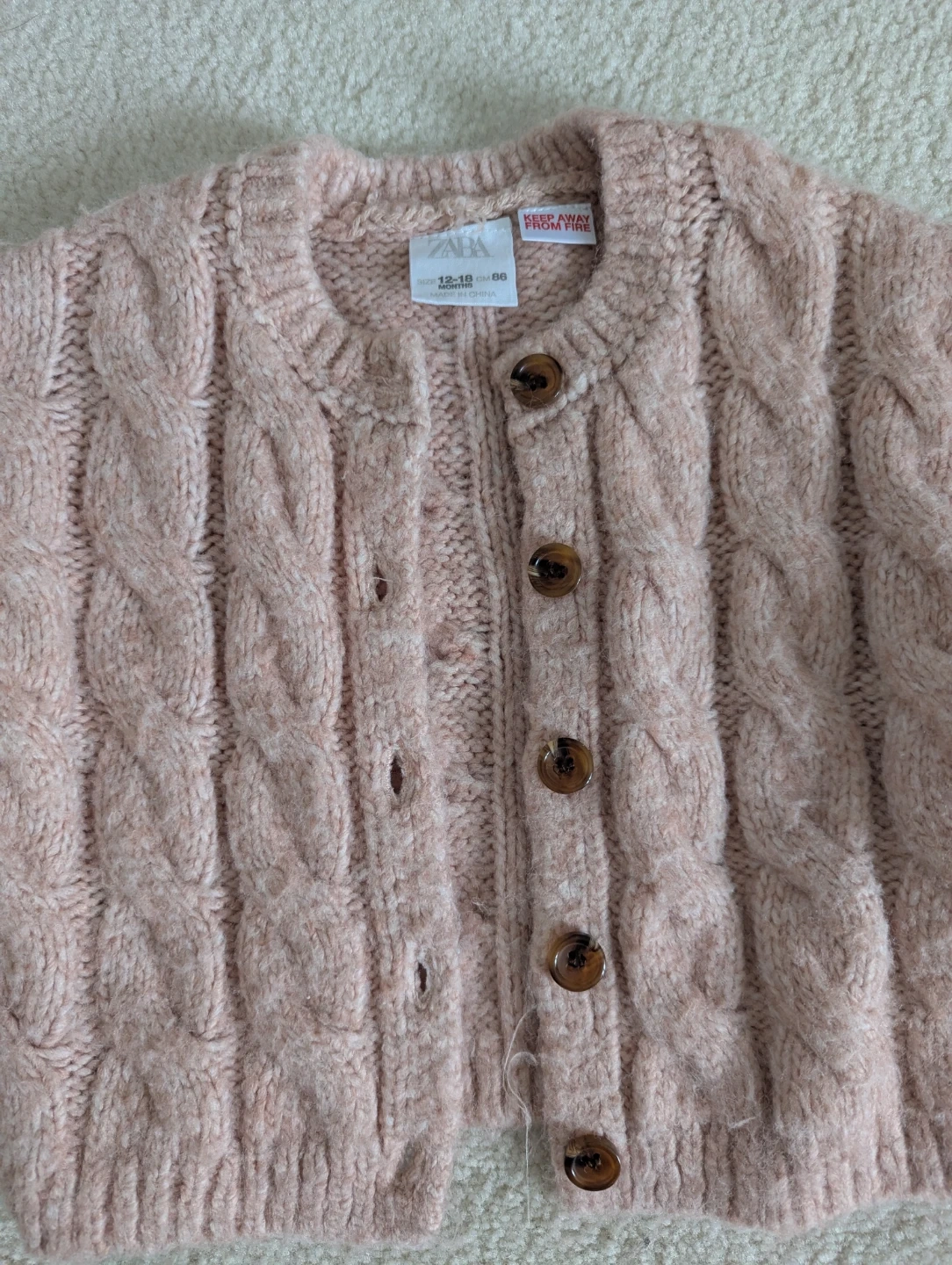 This adorable Zara baby cardigan is in great condition! It's a lovely light pink colour with a chunky knit and cute wooden buttons. Size is 12-18 months (86 cm). Perfect for keeping your little one cozy!
