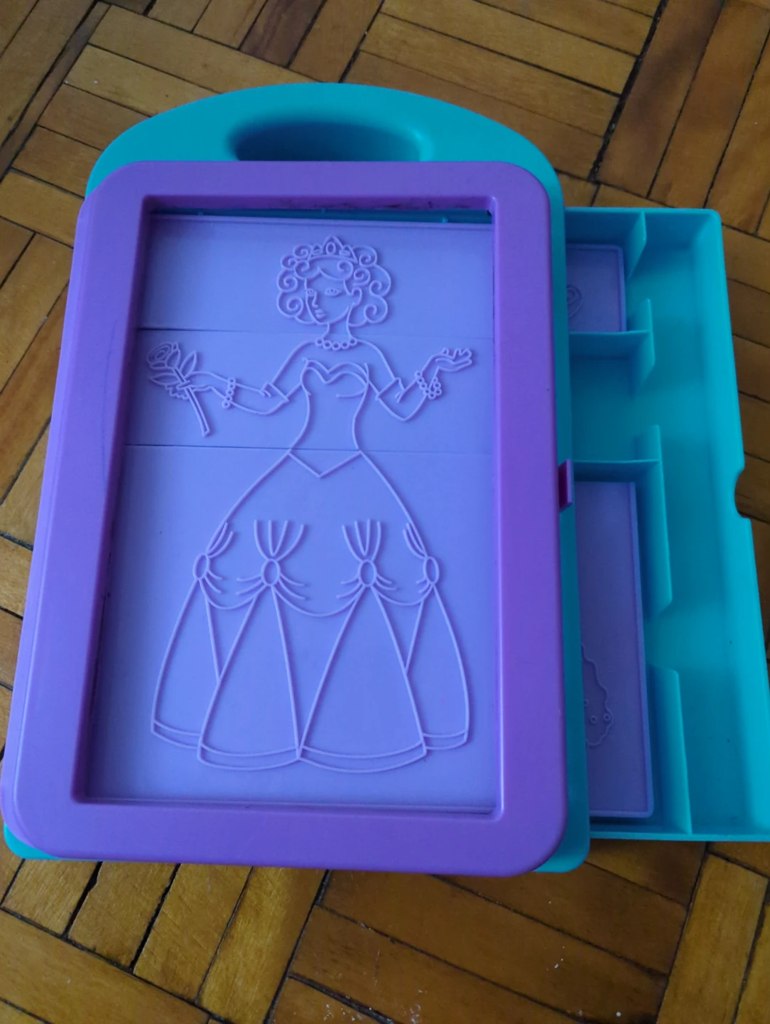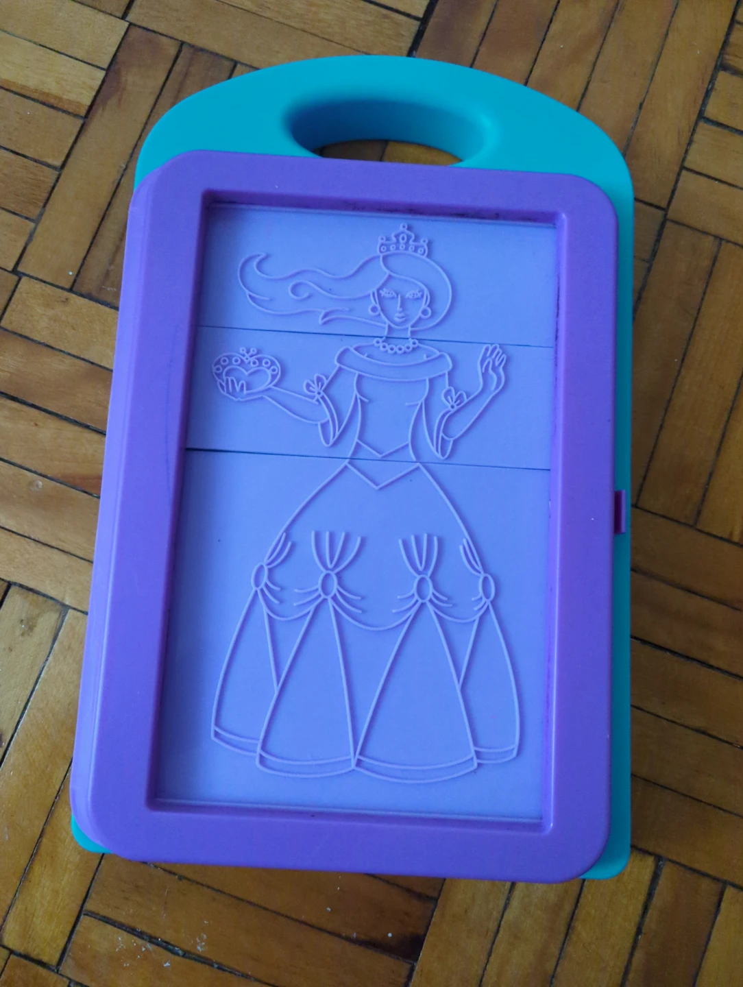 A cute princess puzzle box! It features a purple frame and a turquoise base. Perfect for young children who love puzzles and princesses