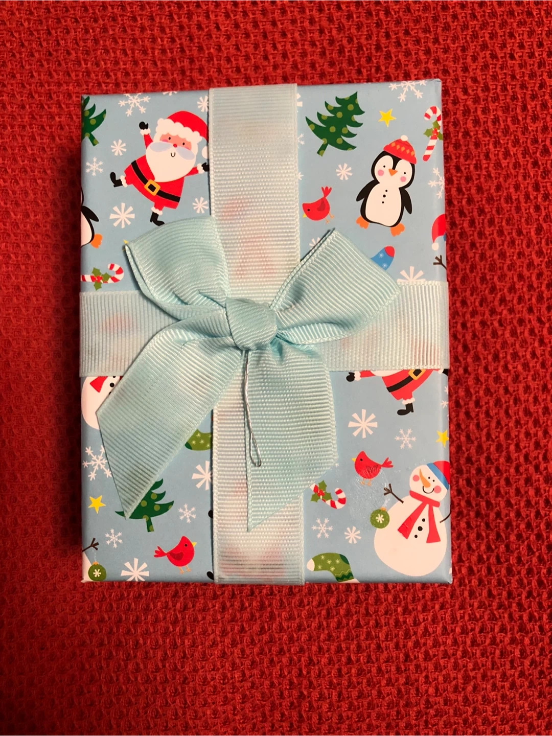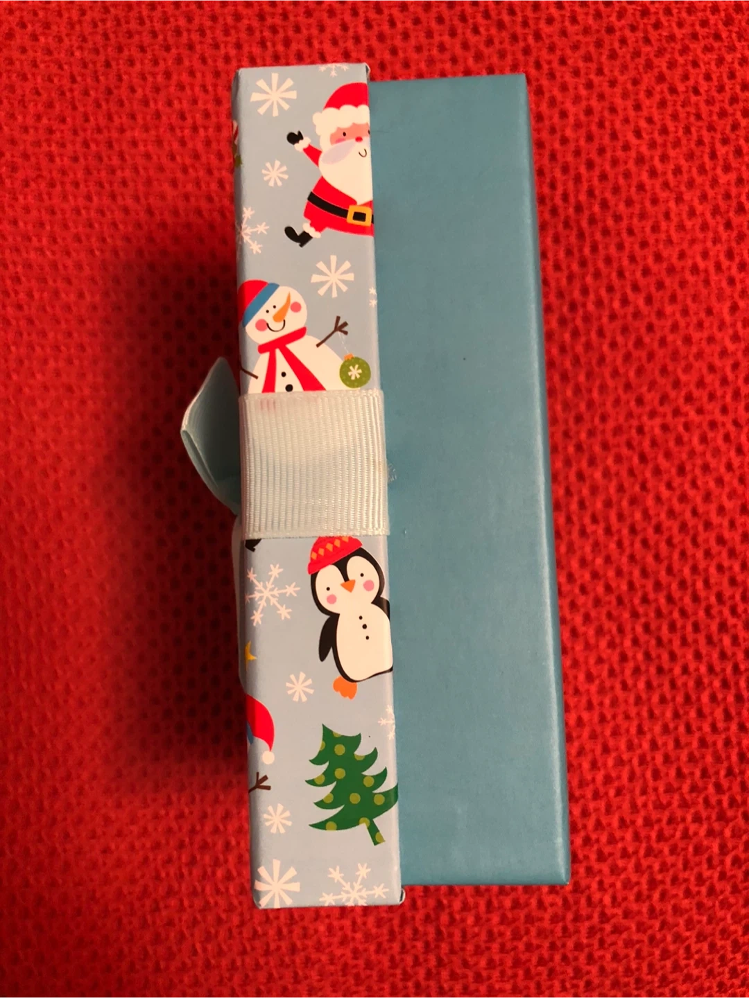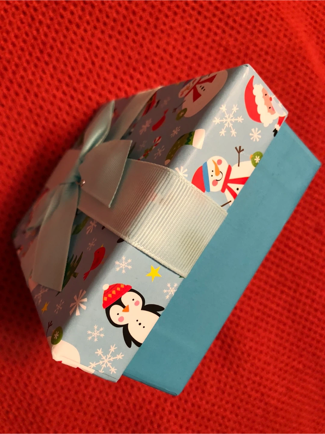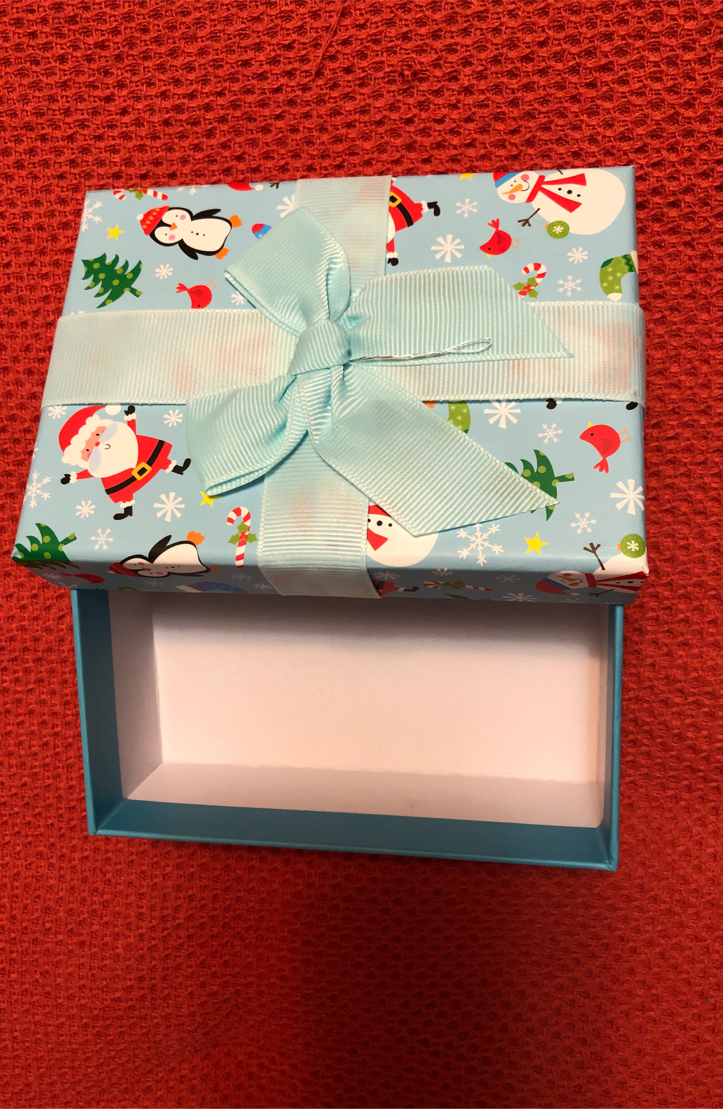 Selling a cute gift box! It has a light blue colour with a festive winter design featuring snowmen, penguins, and Christmas trees. It also includes a light blue ribbon, making it perfect for wrapping presents this holiday season!
