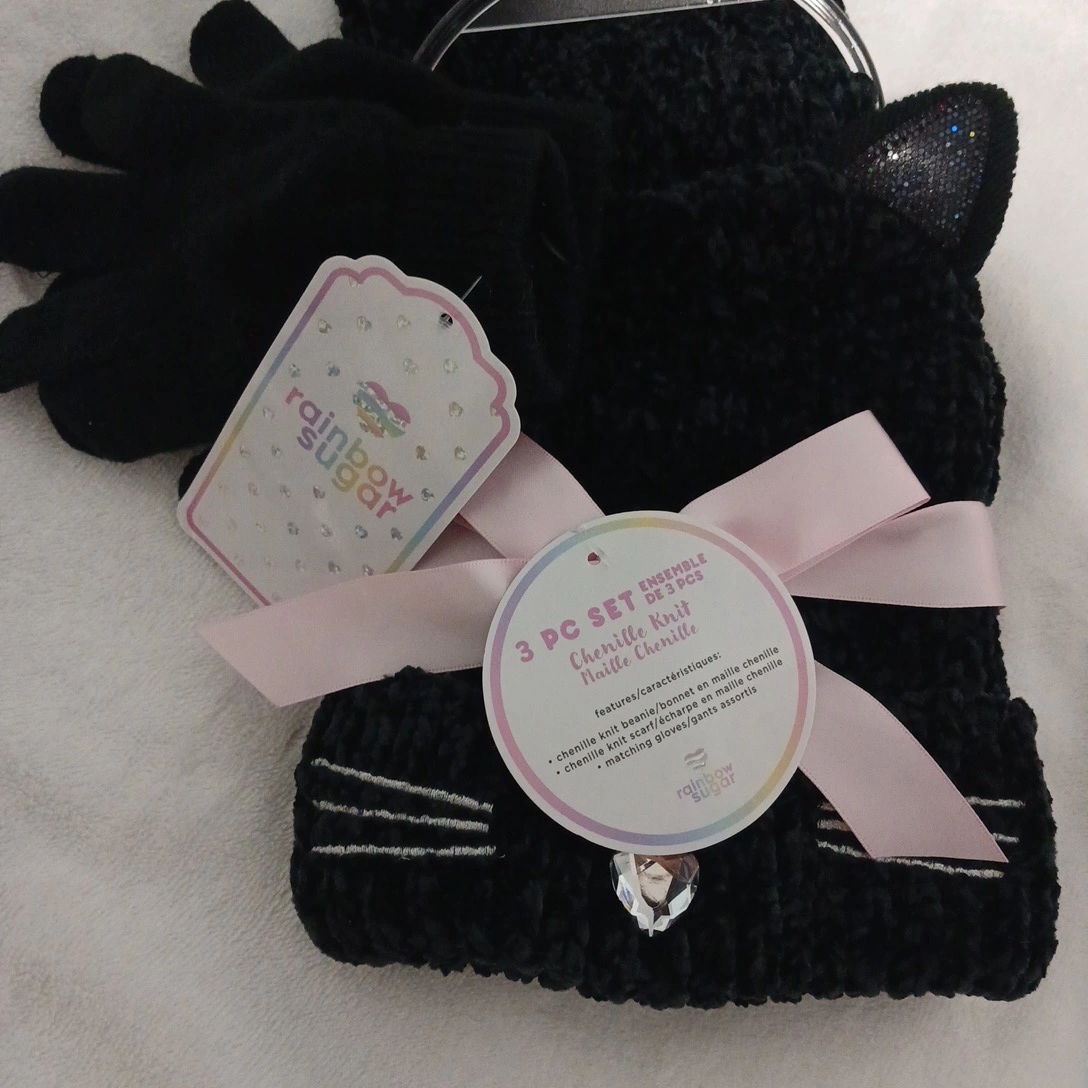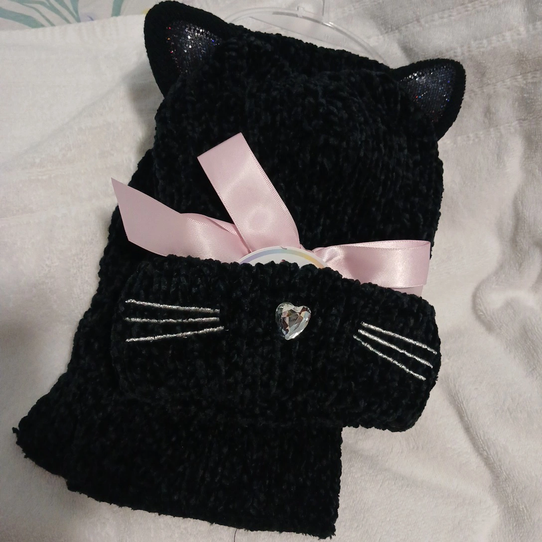 New! 3 piece girls set Black cat kitten winter hat scarf gloves