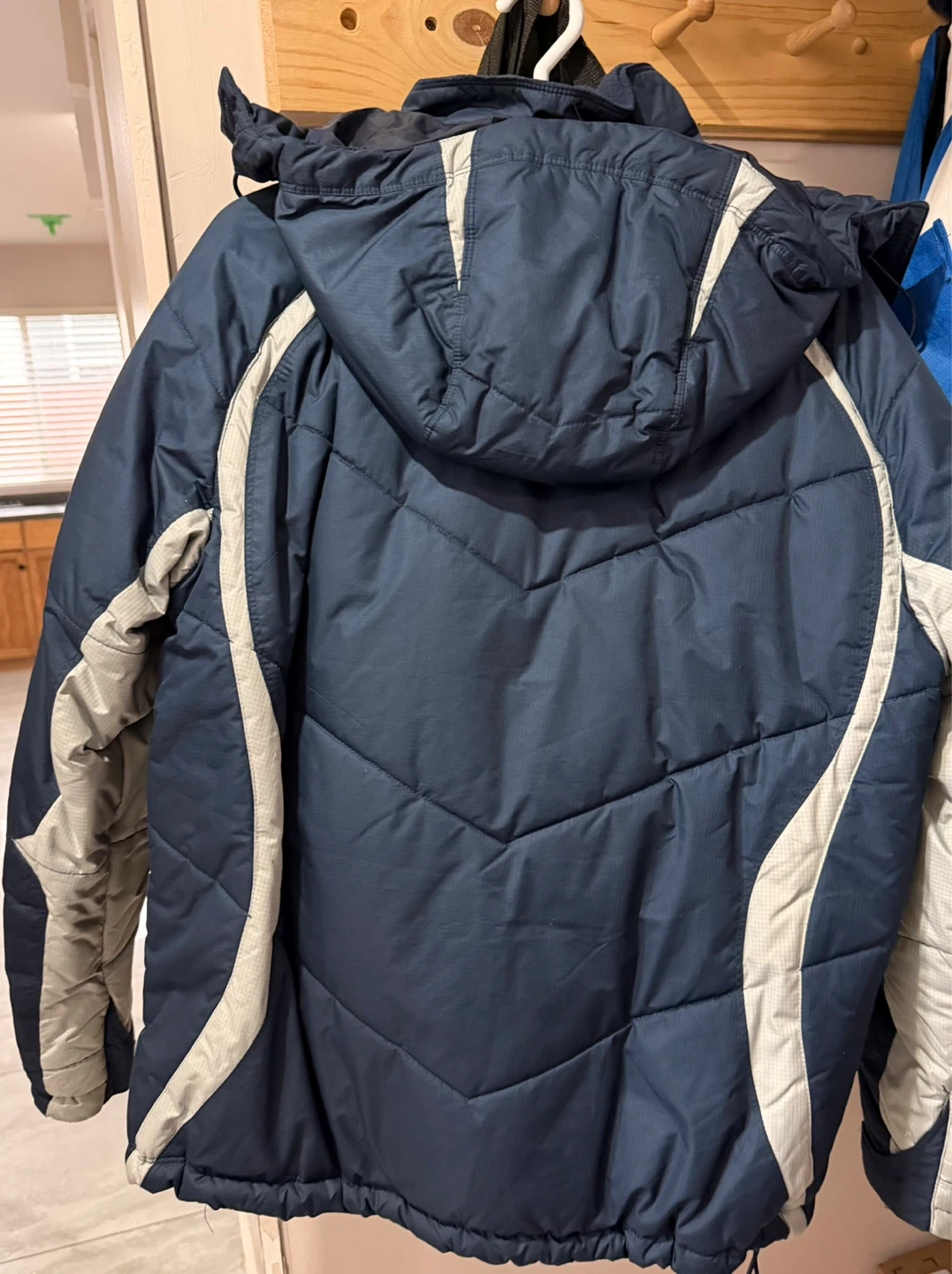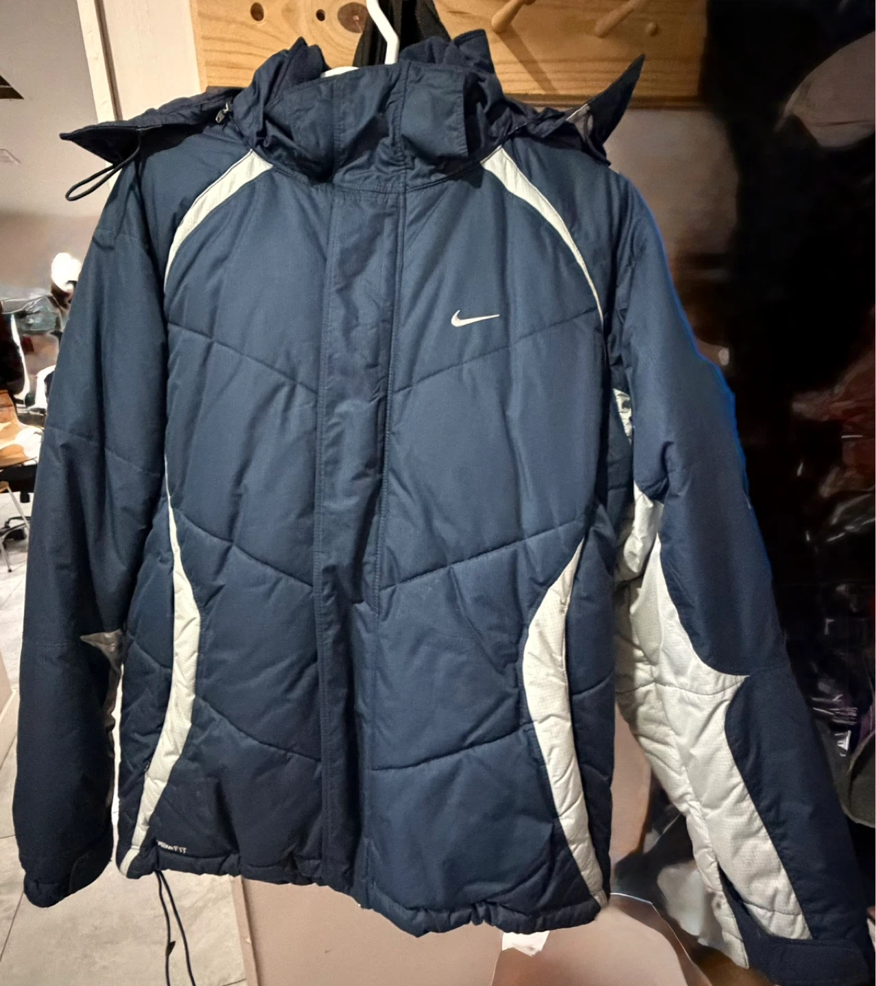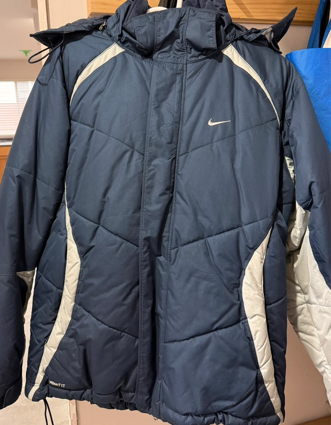 Navy blue puffer jacket with grey accents. Features a full zip and attached hood. NikeFIT technology is incorporated into the design. Perfect for keeping warm on chilly days!