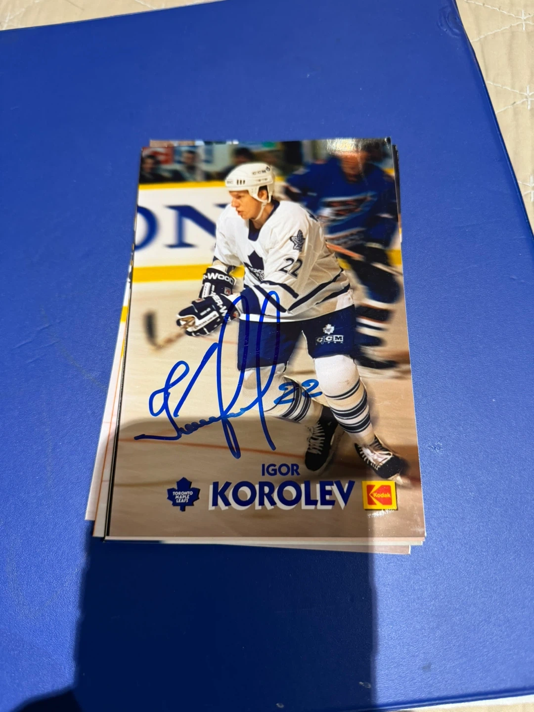 Selling an Igor Korolev signed trading card featuring him in his Toronto Maple Leafs uniform. A great piece for any hockey fan or collector!