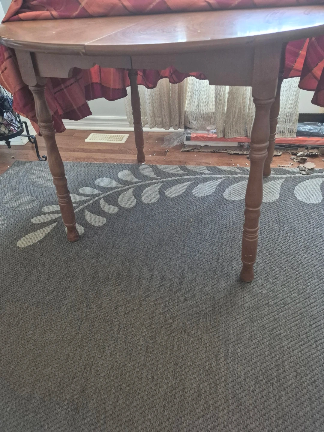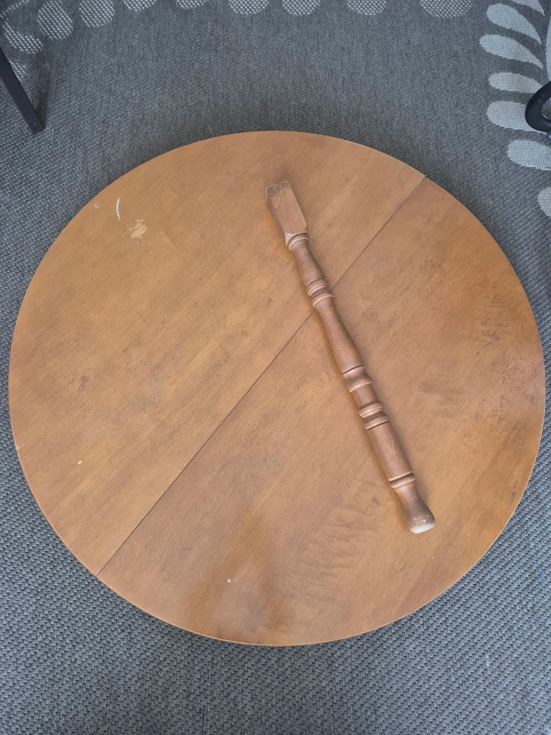 Selling a wooden round table. It's in good condition and would be a great addition to any home. It features a classic design with sturdy legs.