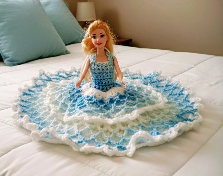 This is a beautiful, handmade crochet doll dress in lovely shades of blue and white! It's in great condition and would be perfect for a special doll or as a decorative piece. The intricate crochet work adds a unique touch!