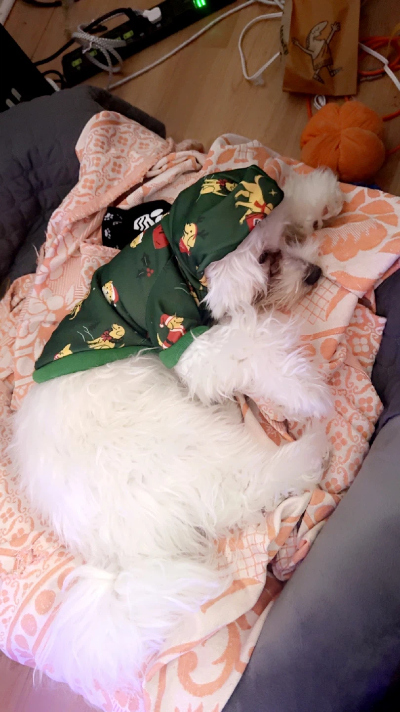 This adorable, BARELY used puppy Christmas outfit, sized for a small dog, features a festive green fabric with a charming holiday design. It's perfect for keeping your furry friend cozy and stylish during the holiday season.