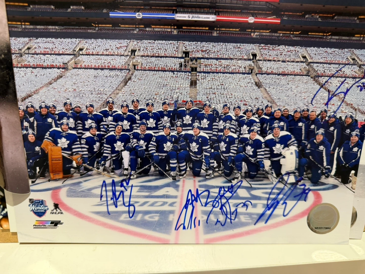 Selling a signed photo of the Toronto Maple Leafs 2014 Winter Classic team! It's a great piece for any Leafs fan or hockey collector. The signatures add a unique touch to this commemorative photo.