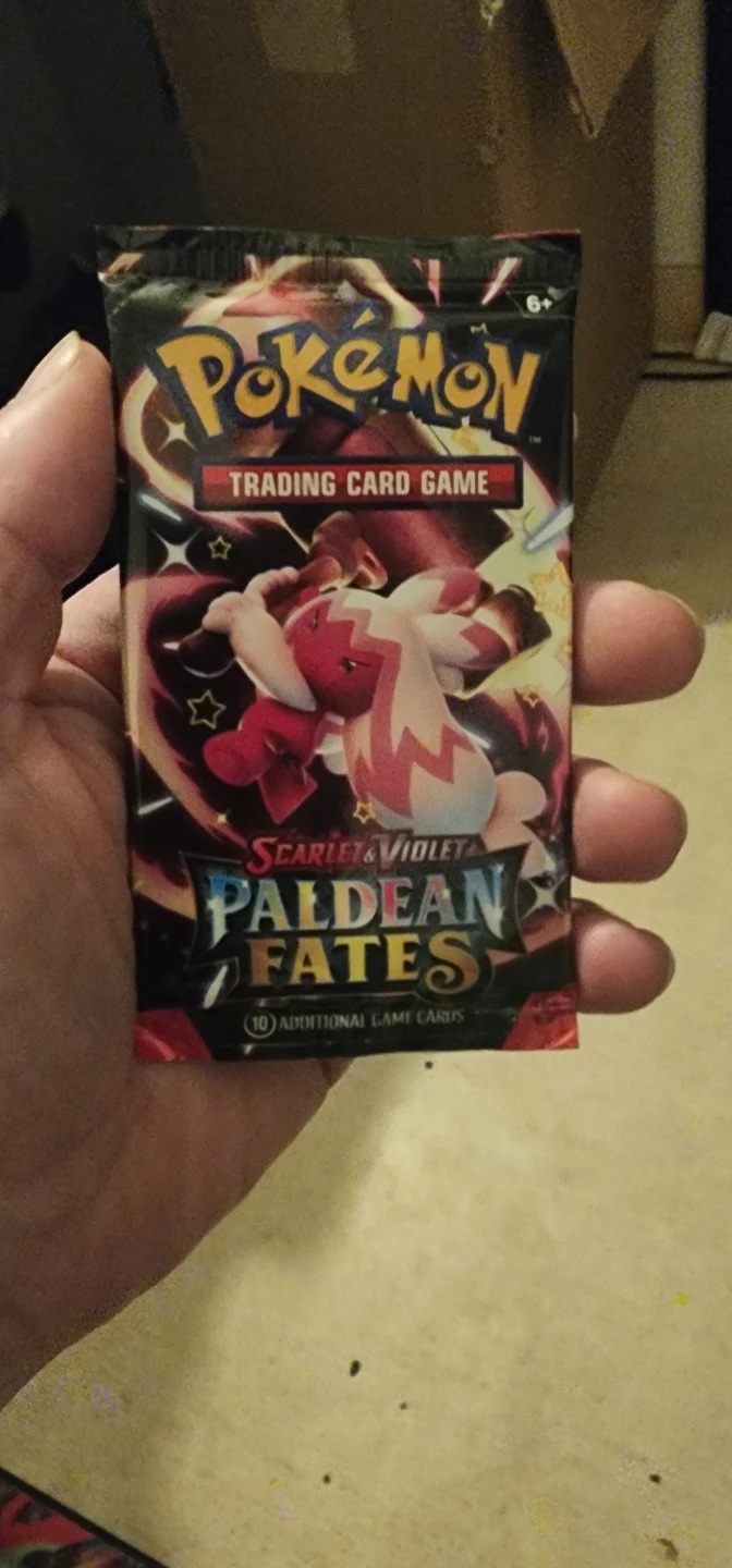 Selling a pack of Pokemon Scarlet & Violet Paldean Fates trading cards! This pack includes 10 additional game cards, perfect for expanding your collection or getting into the game
