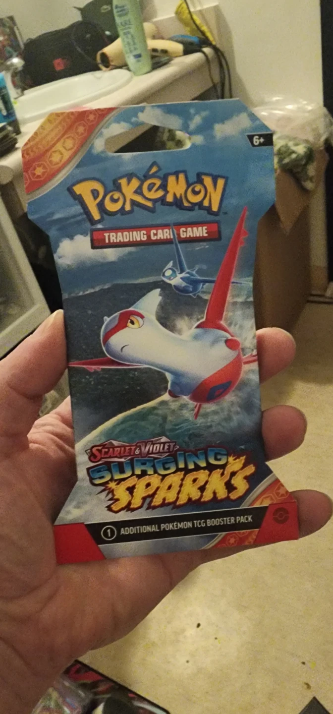 Selling a Pokemon Trading Card Game booster pack from the Scarlet & Violet series, specifically the Surging Sparks set! This booster pack includes additional Pokemon TCG cards and is suitable for ages 6+