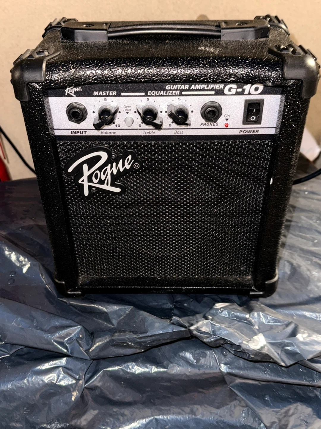 Selling a Rogue G-10 guitar amplifier. It has a master equalizer with volume, treble, and bass controls. Also features an input, phone jack, and power switch.