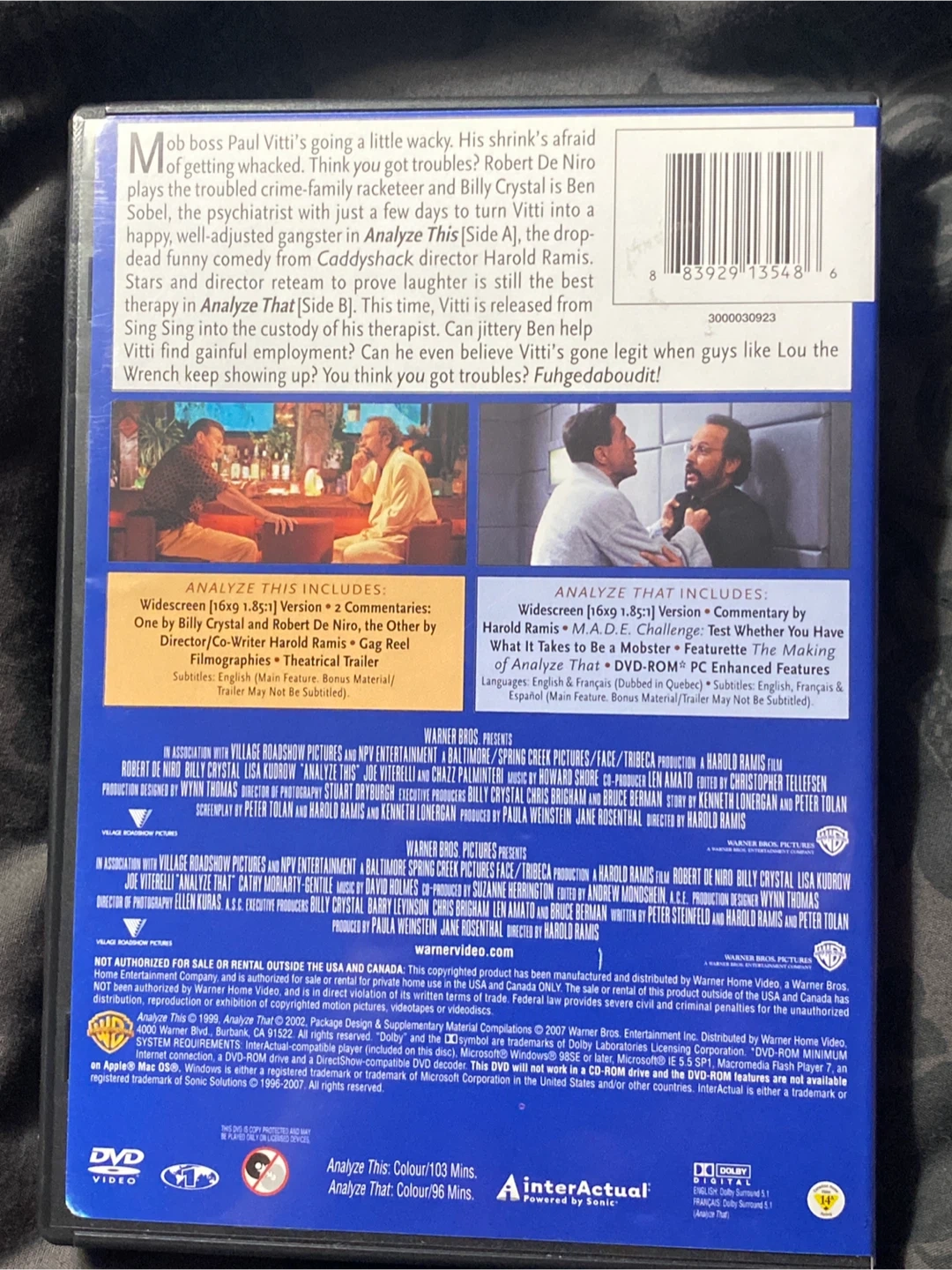Selling a double feature DVD including the movies Analyze This and Analyze That, starring Robert De Niro and Billy Crystal! Both widescreen versions are included, as well as commentaries and trailers.
