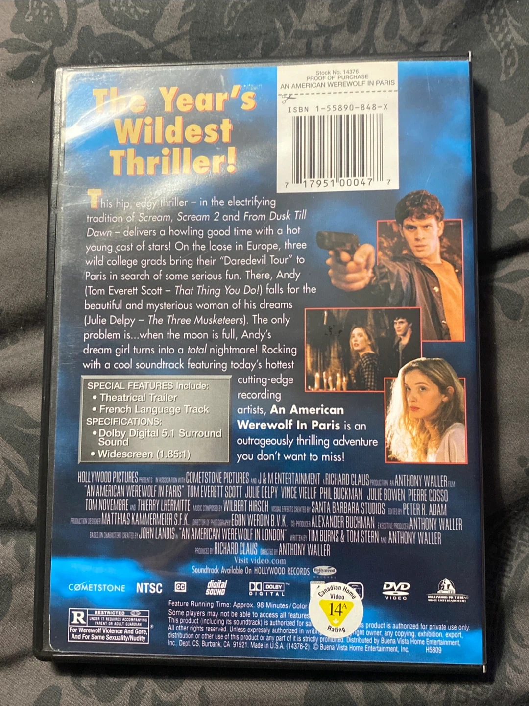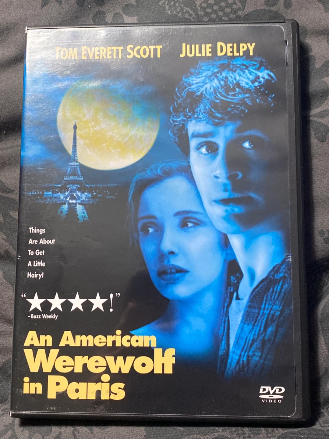 Selling a DVD of "An American Werewolf in Paris" starring Tom Everett Scott and Julie Delpy! It's a comedy horror film about an American tourist who falls in love with a mysterious woman in Paris, only to discover she's a werewolf