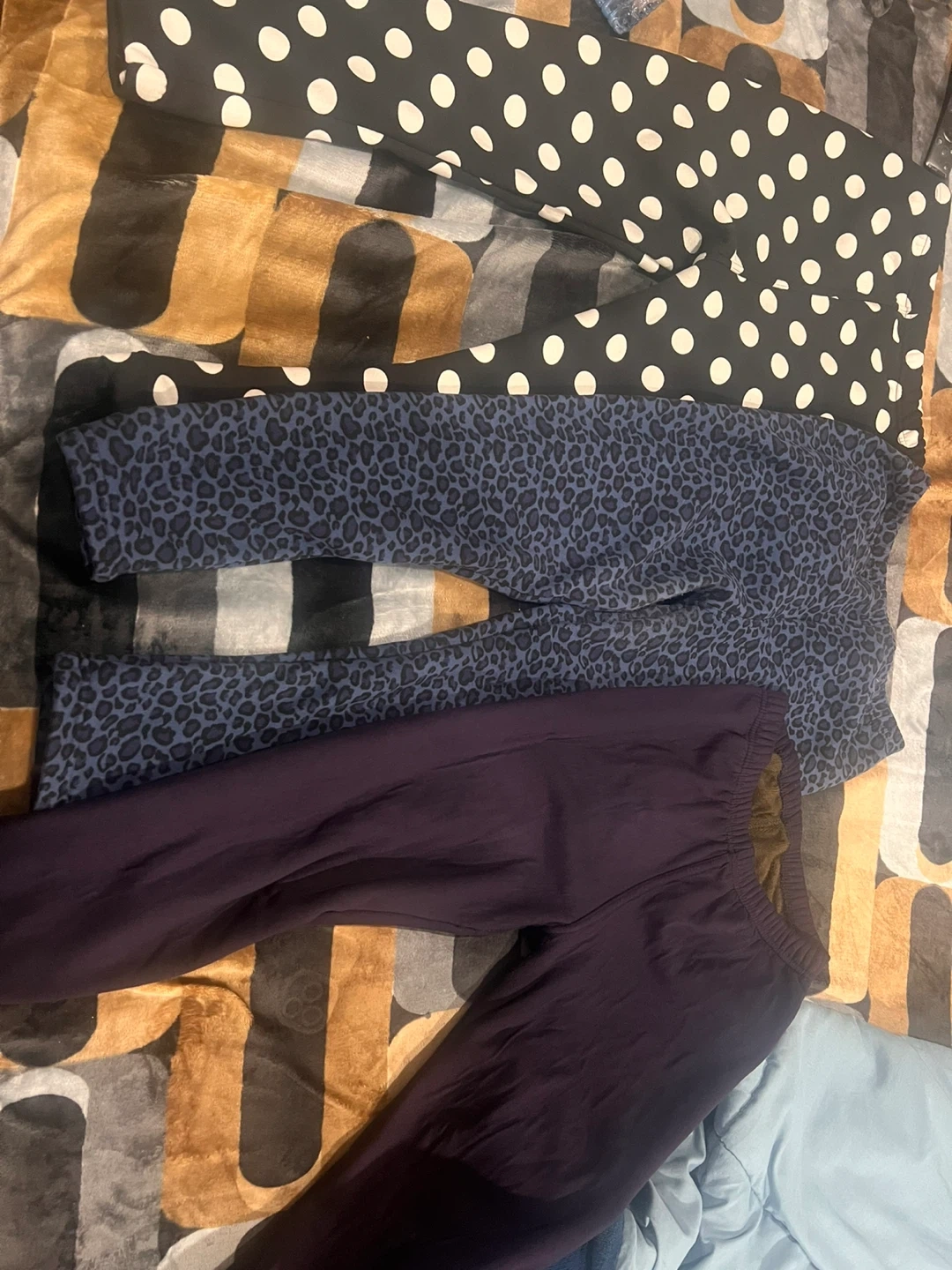 Selling a set of women's leggings. There are three pairs with different patterns and colours. They appear to be in good condition. Size is not marked.