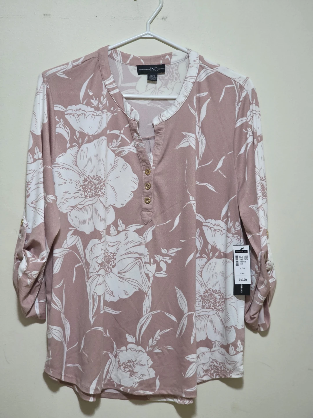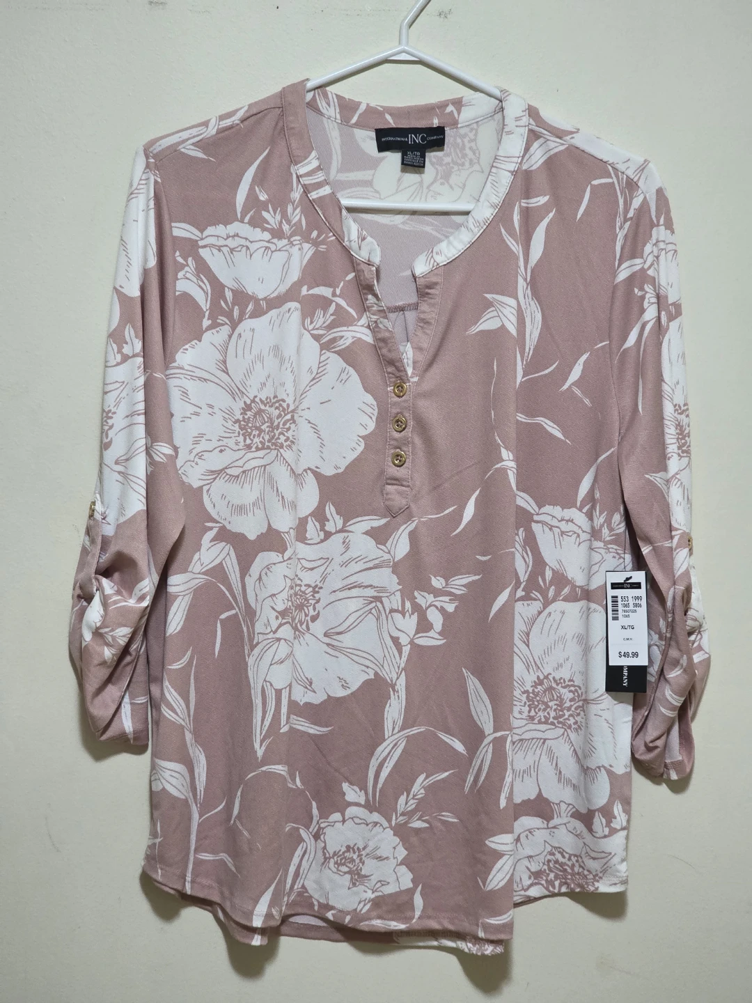 This is a beautiful floral blouse from INC International Concepts! It features a lovely floral pattern in pink and white, perfect for adding a touch of elegance to your wardrobe. It's a size XL and in excellent condition. The original price was $49.50