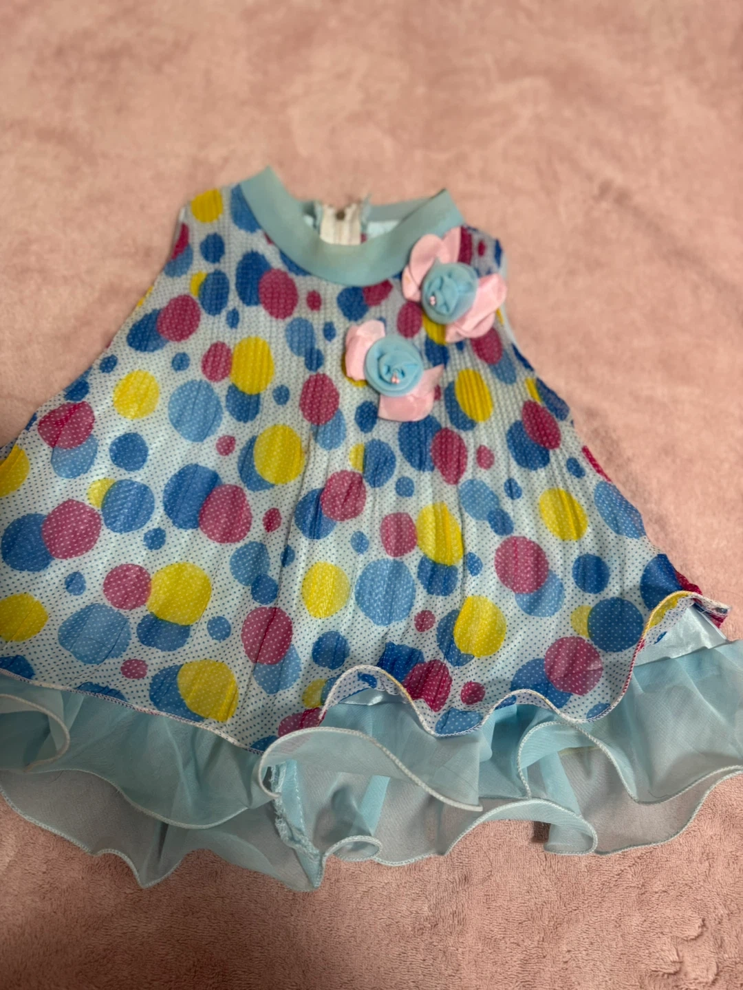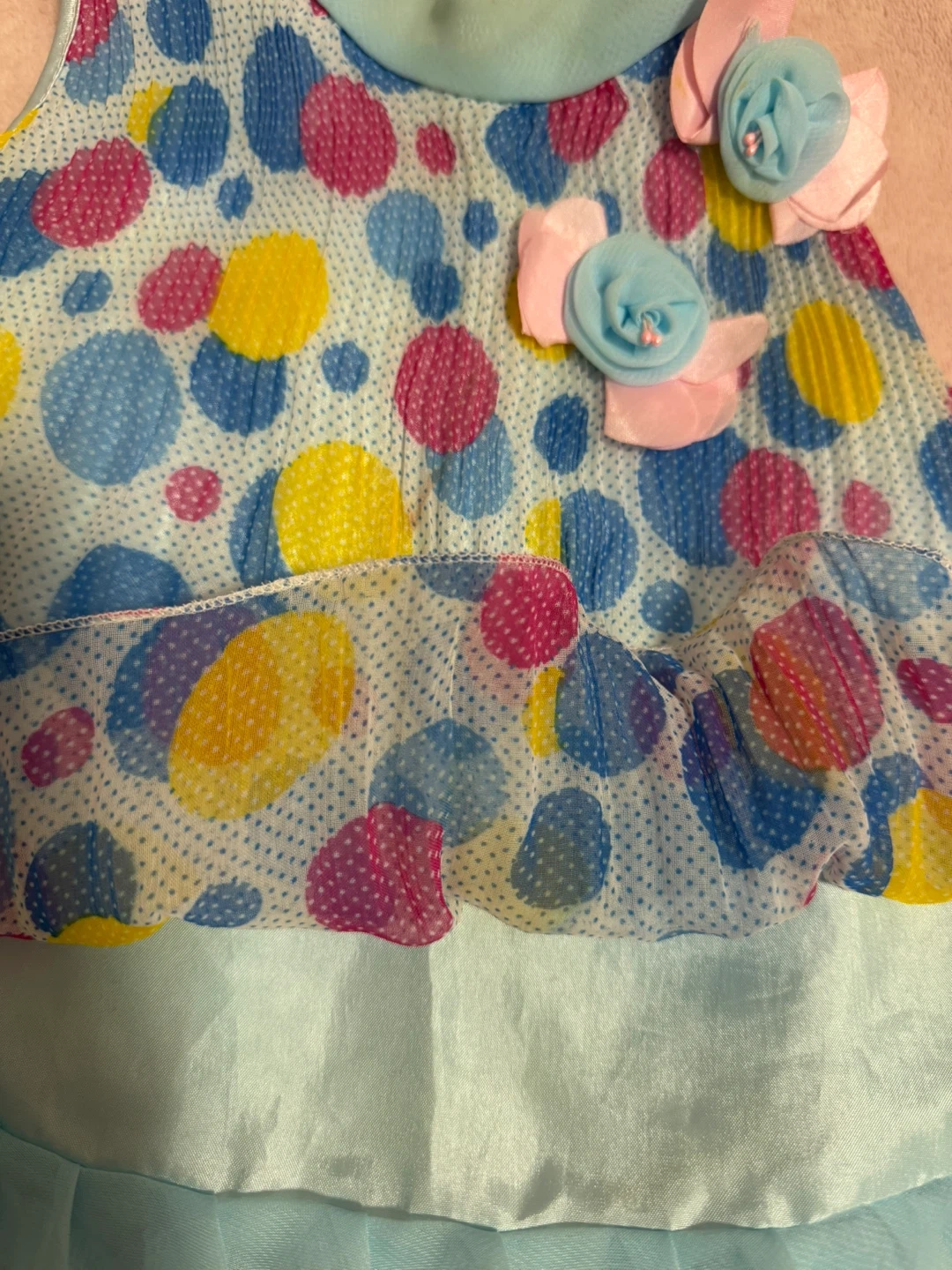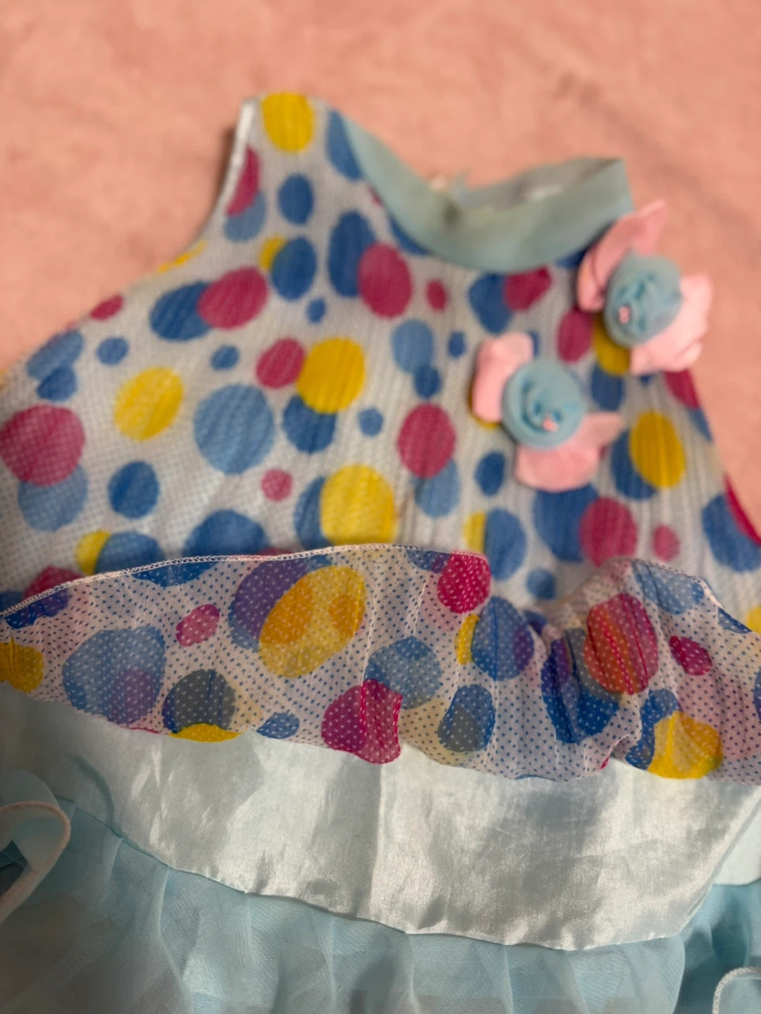 This adorable little dress is perfect for a special occasion or just a fun day out! It features a playful polka dot pattern in blue, yellow, and pink, and it's decorated with sweet little flower accents. The dress also has a light blue frilly hem. It's in great condition and ready for a new little owner!