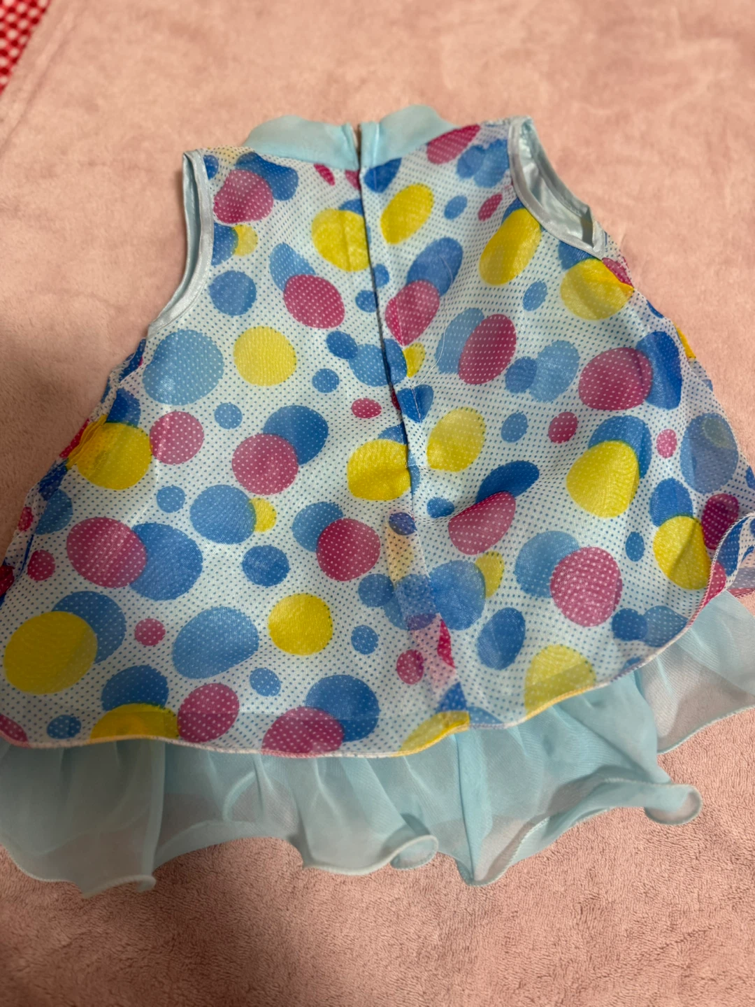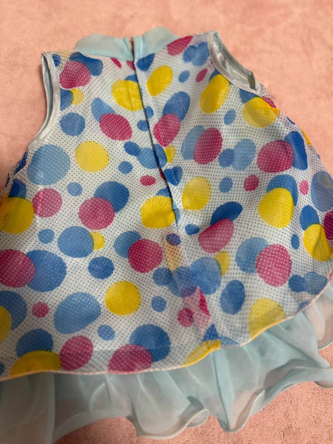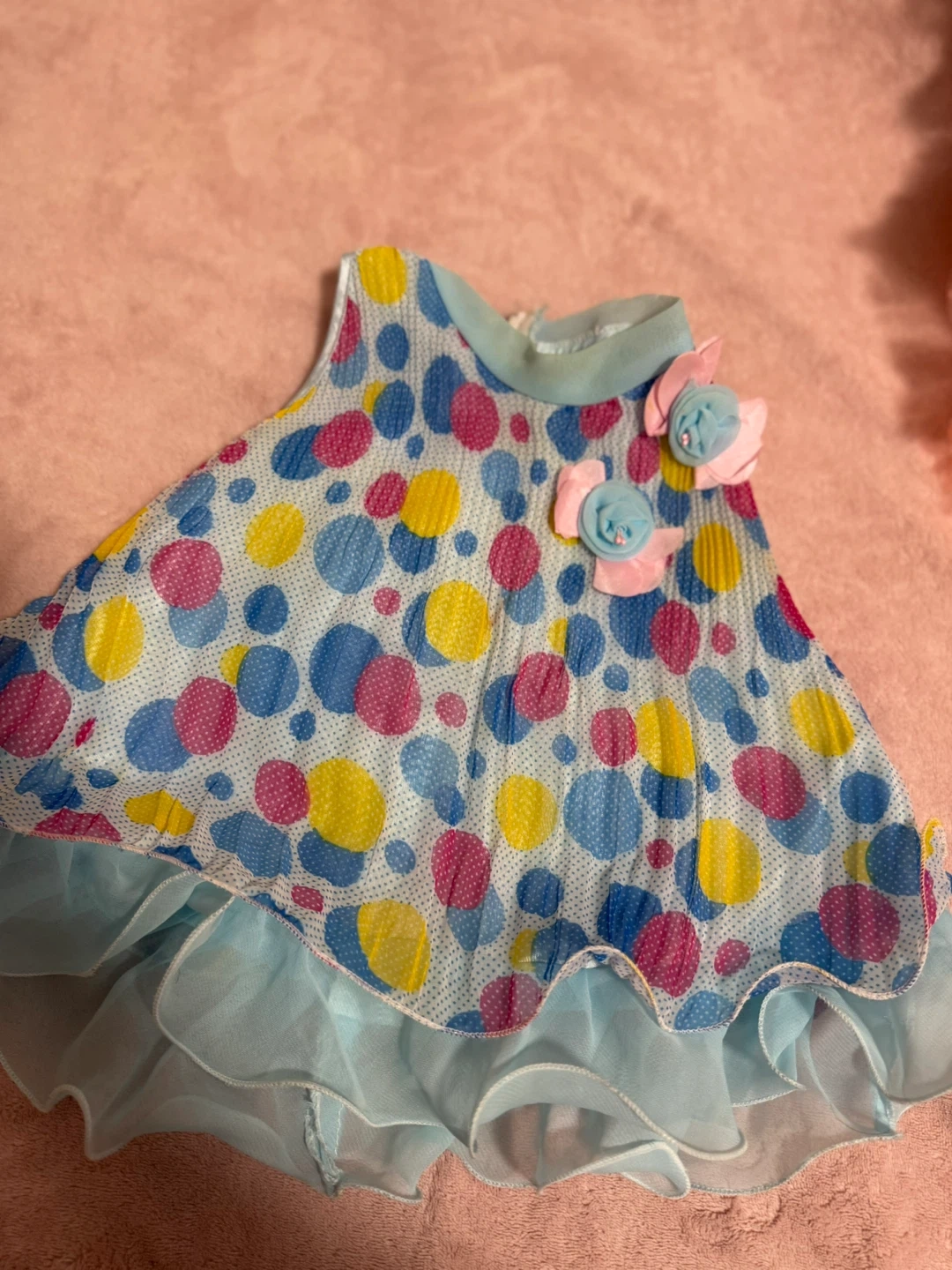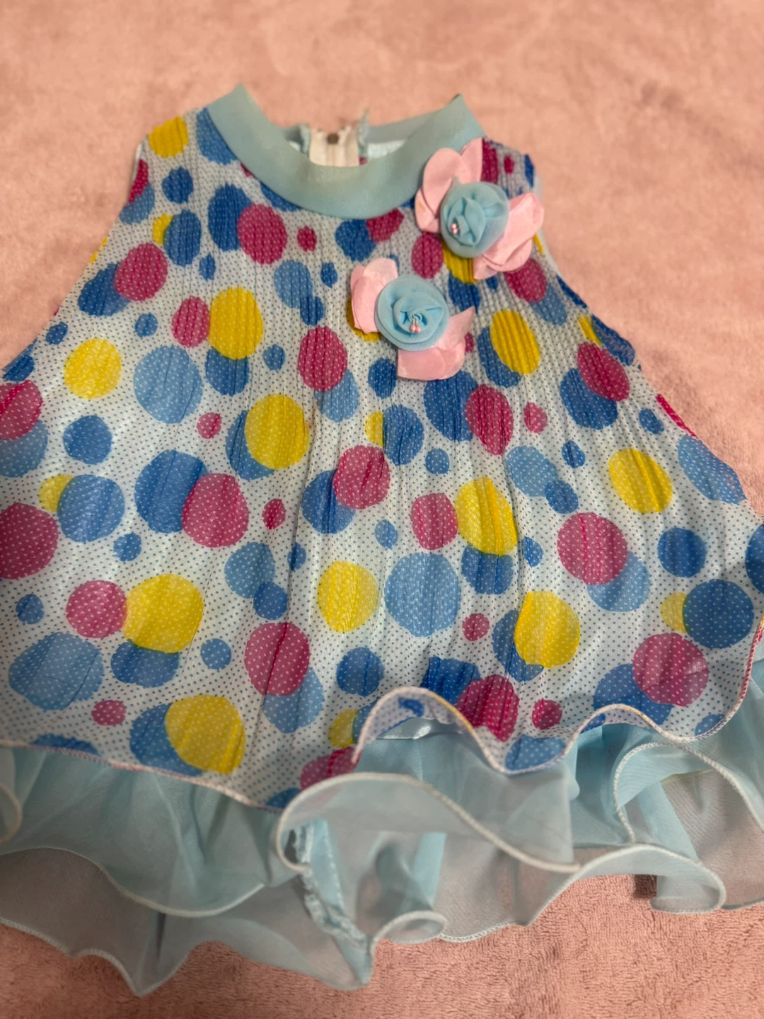 This adorable little dress is perfect for a special occasion or just a fun day out! It features a playful polka dot pattern in blue, yellow, and pink, and it's decorated with sweet little flower accents. The dress also has a light blue frilly hem. It's in great condition and ready for a new little owner!