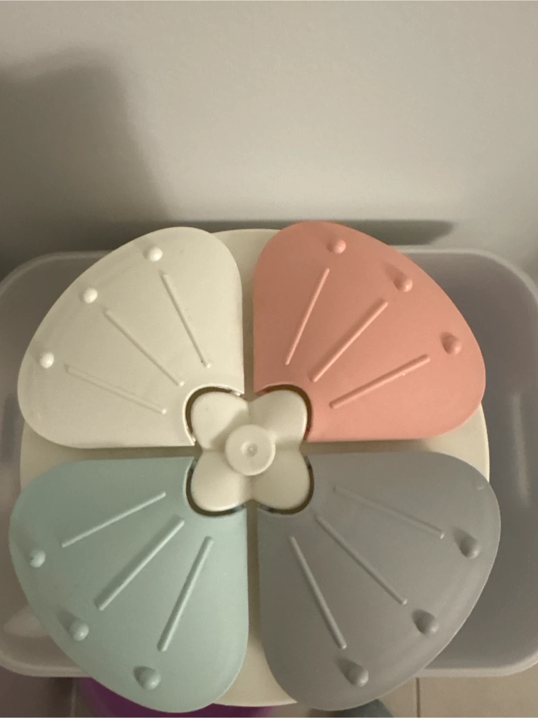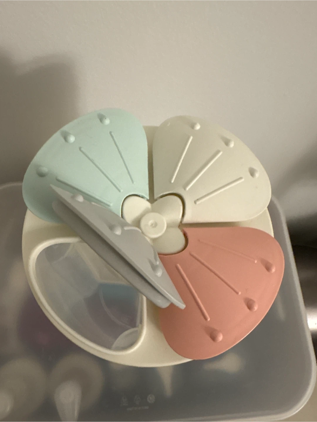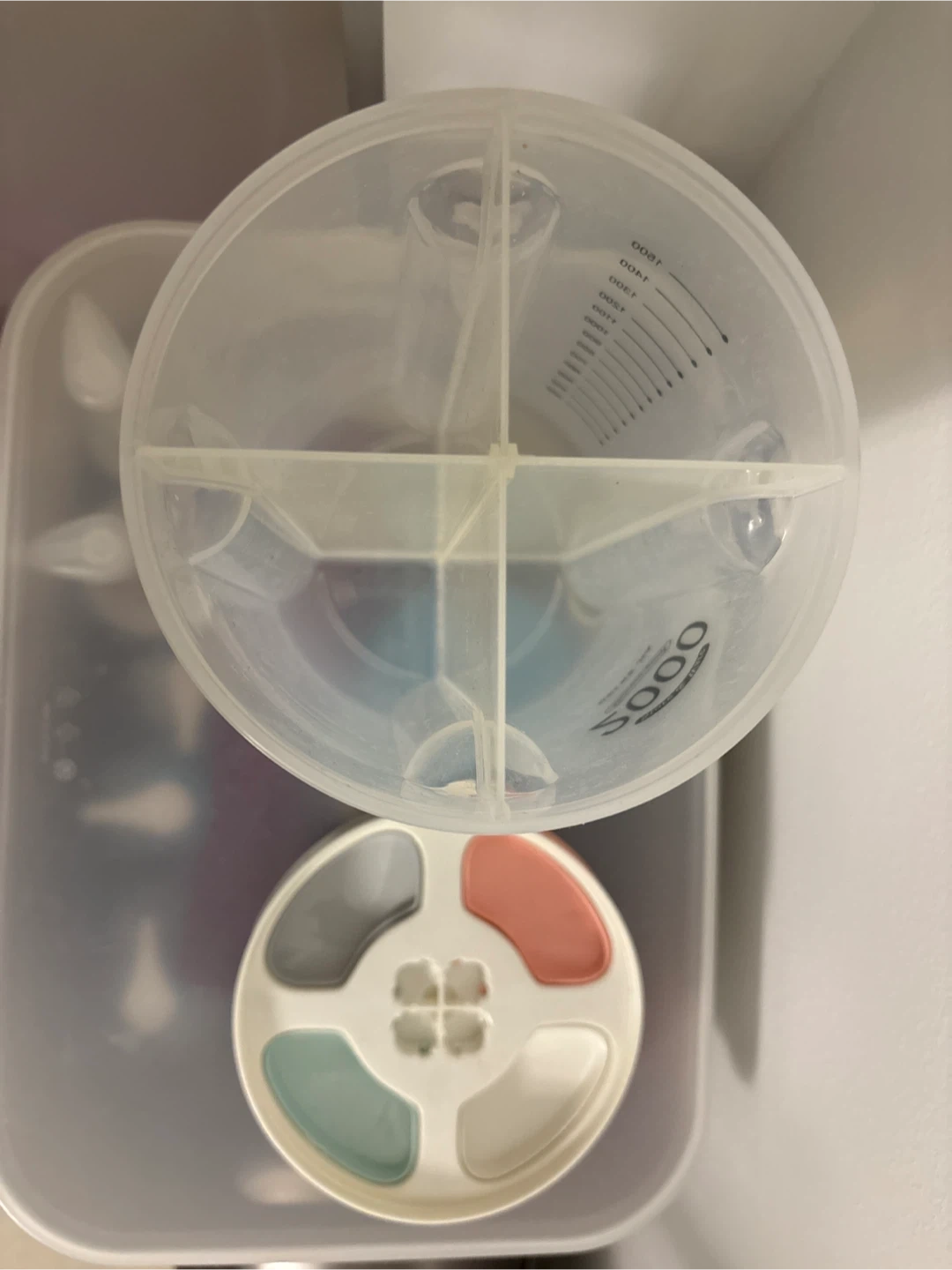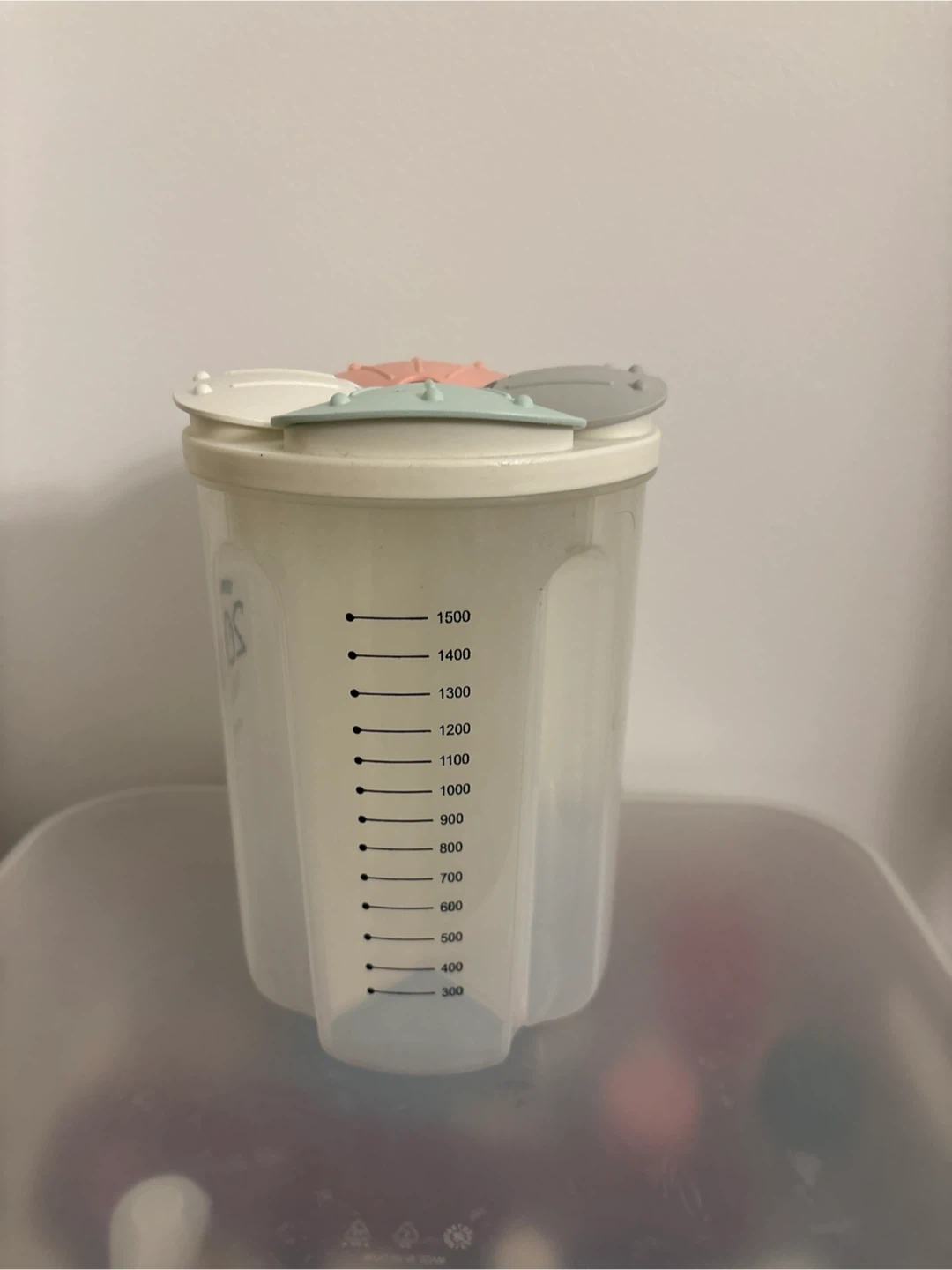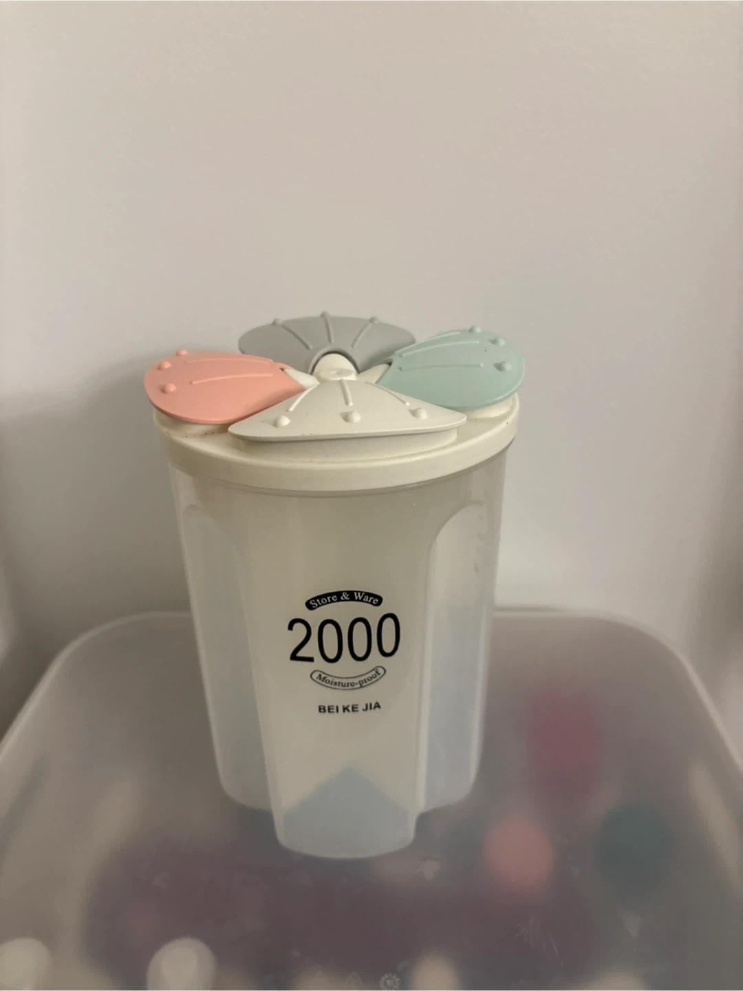 Selling a Bei Ke Jia Store & Ware 2000 food storage container. It has a unique four-compartment lid with cute pastel colours. The container is marked with measurements up to 1500.